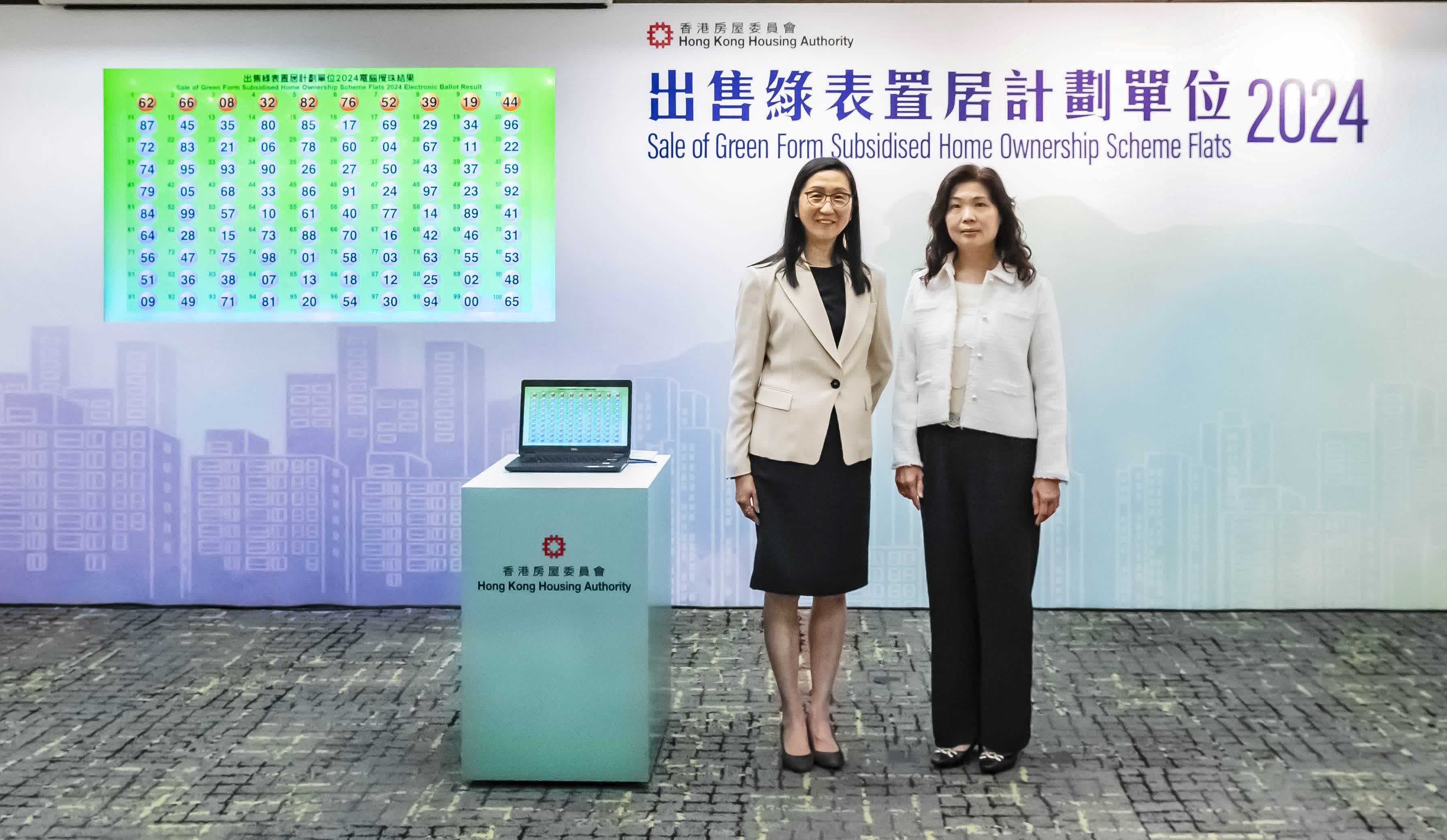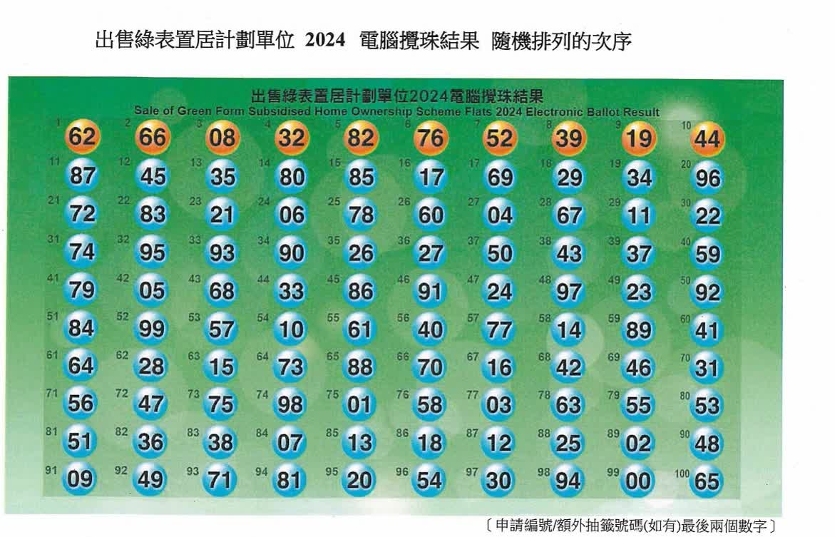 香港文匯報訊 綠置居2024今日(2日)進行攪珠,結果詳見下表,亦已上載於房委會/房屋署的指定網站,首10個攪出的號碼,依次是62、66、08、32、82、76、52、39、19及44。網上遞交申請的申請者會於攪珠儀式完成後陸續收到電郵通知有關攪珠結果。新一期綠置居主要推售九龍灣宏緻苑合共2,576個新單位,符合資格的申請人預計最快可於今年第四季開始揀樓。今期申請共接獲3.6萬份申請,其中1.2萬份是新申請,超額認購13倍,倍數比以往低。主持攪珠儀式的房委會資助房屋小組委員會主席黃碧如指,倍數高低受很多因素影響,包括社會經濟狀況以及利息等,不是每次超額數十倍才算成功。