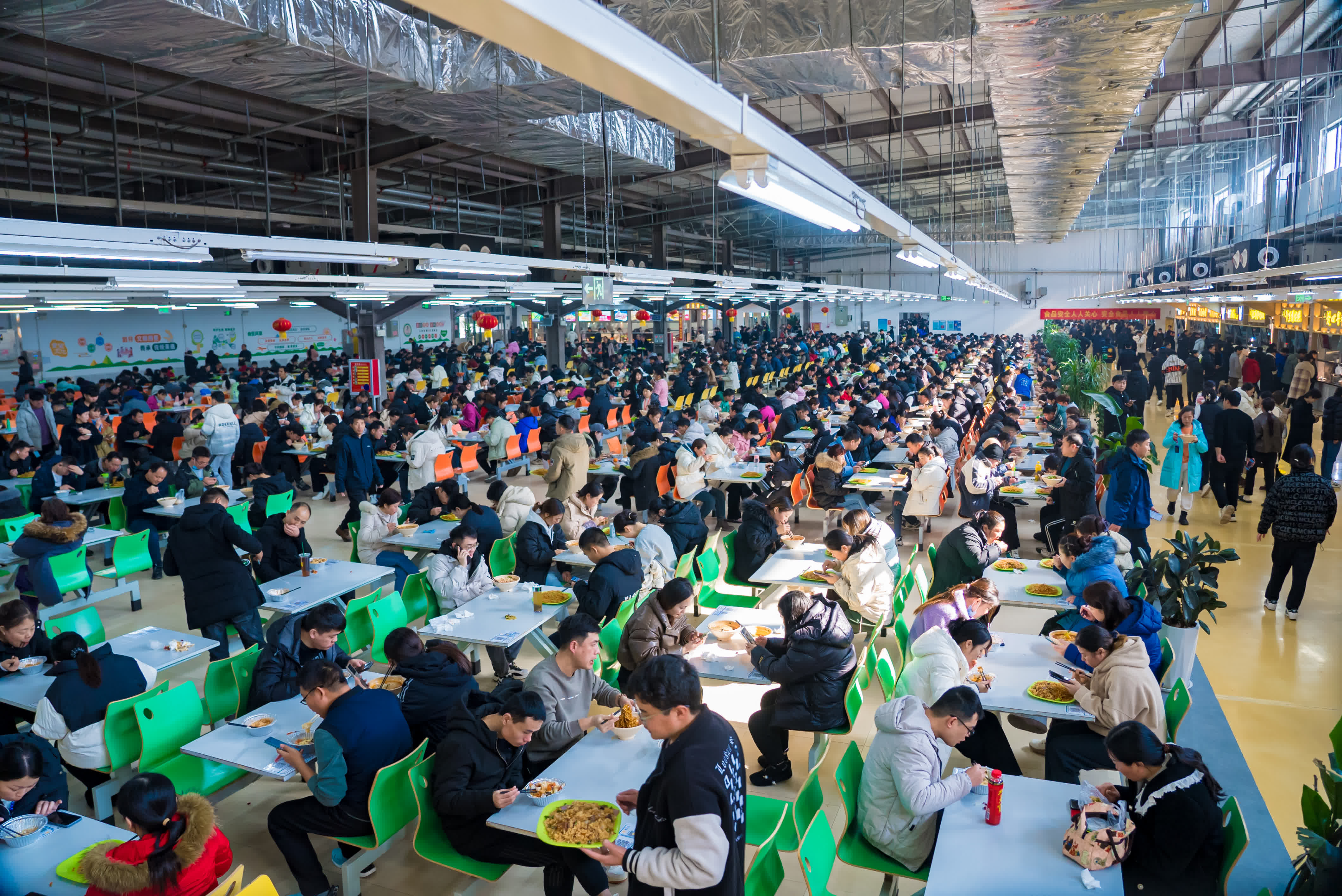 中午12時,F15盛禾餐廳內6000名員工同時開餐,港式燒臘、廣式腸粉等美食應有盡有。園區內9棟餐樓、200個檔口,食材均通過38項安全檢測。宿舍區也煥然一新:78棟1.9萬間公寓配齊空調、熱水器,人均空間增加三成。政府與企業今年已合辦近2000場社區活動,「住得舒心,才留得住人。」