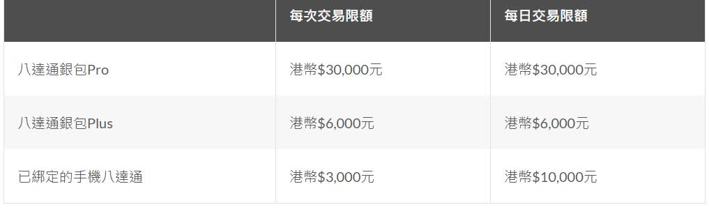 八達通銀包Plus及Pro(已認證) 及已綁定至已認證八達通銀包的手機八達通的每次交易金額和每日限額如下: