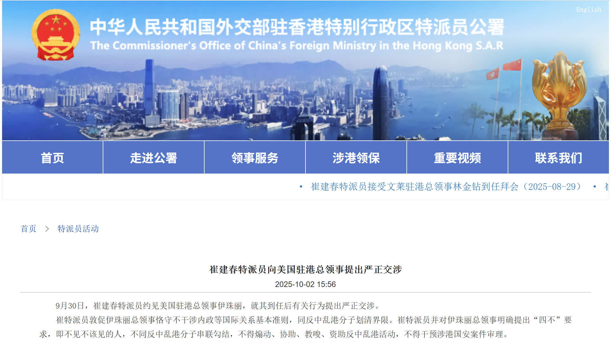 9月30日,崔建春特派員約見美國駐港總領事伊珠麗,就其到任後有關行為提出嚴正交涉。