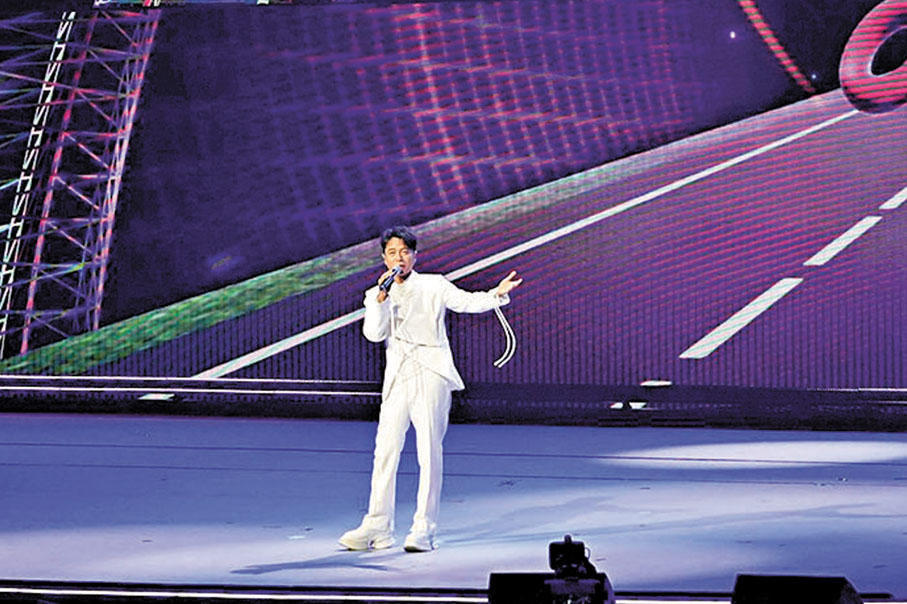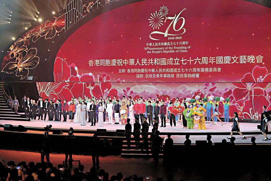 香港文匯報訊(記者 阿祖、子棠、達里)紫荊花開,香江燈火映照赤子之心。昨晚多位影視紅星在紅館舉行的「香港同胞慶祝中華人民共和國成立七十六周年國慶文藝晚會」中獻聲。李克勤、譚輝智、古淖文、谷婭溦、張明敏、江旻憓、雷佳、胡海泉、李斯丹妮、伍珂玥、姚珏及曾小敏等,聯袂獻藝賀國慶。