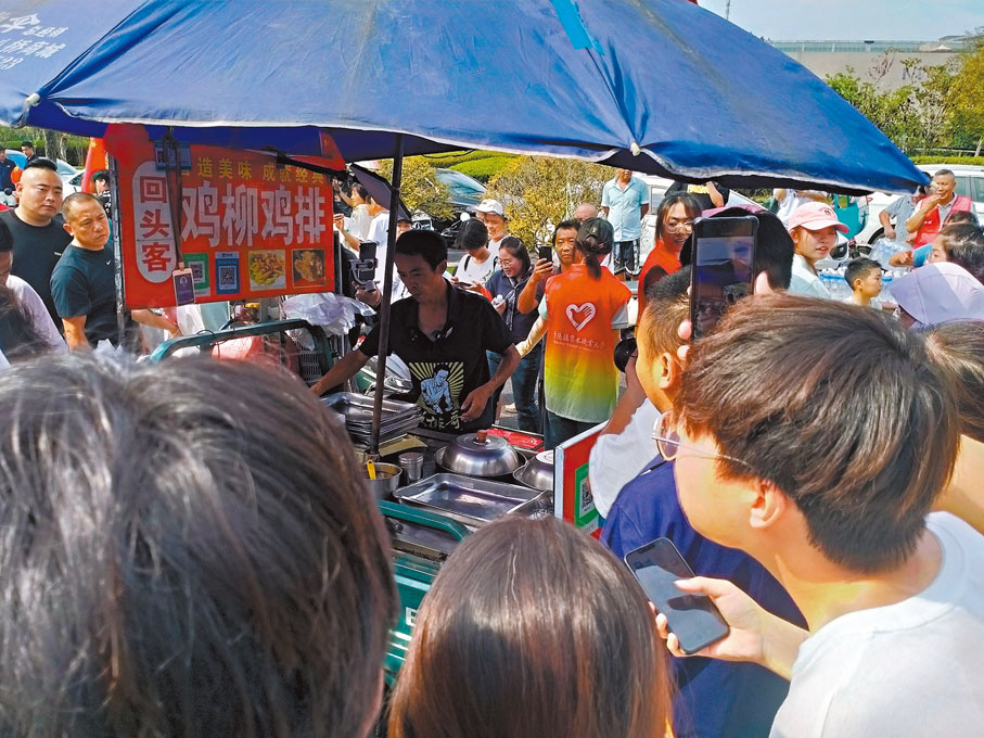 香港文匯報訊(記者 黃慧 江西報道)「這個國慶不放假,我給大家炸雞排。歡迎大家來到景德鎮享受美景和美食。」內地黃金周長假開啟,江西「雞排哥」李俊永的攤位前,全國各地慕名前來嘗鮮的遊客排起了長隊。雞排酥脆、氣氛活躍,這充滿治癒人心的煙火氣,成為千年瓷都一道靚麗的風景線。