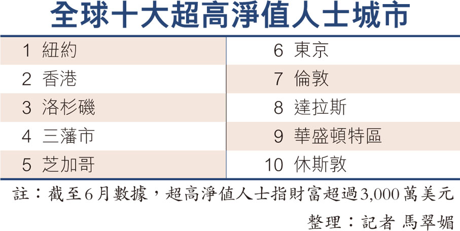 香港繼續位列全球第二,僅次於擁有21,380名超級富豪的紐約。報告分析指,本港財富暴漲主要受兩大因素驅動,包括地產改革與強勁股市收益,其中金融業受益於大量內地企業赴港上市,推動資本市場繁榮。