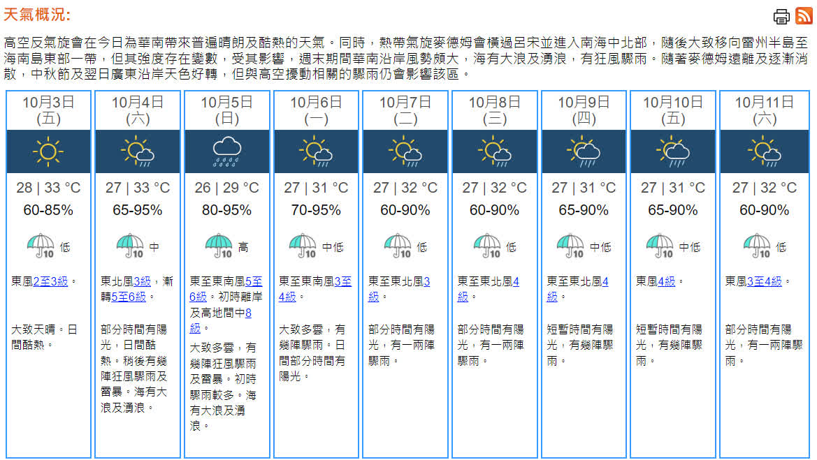 展望星期六日間酷熱,稍後至星期日風勢頗大,間中有狂風驟雨,星期日稍後驟雨減少。中秋節及翌日部分時間有陽光,有幾陣驟雨。