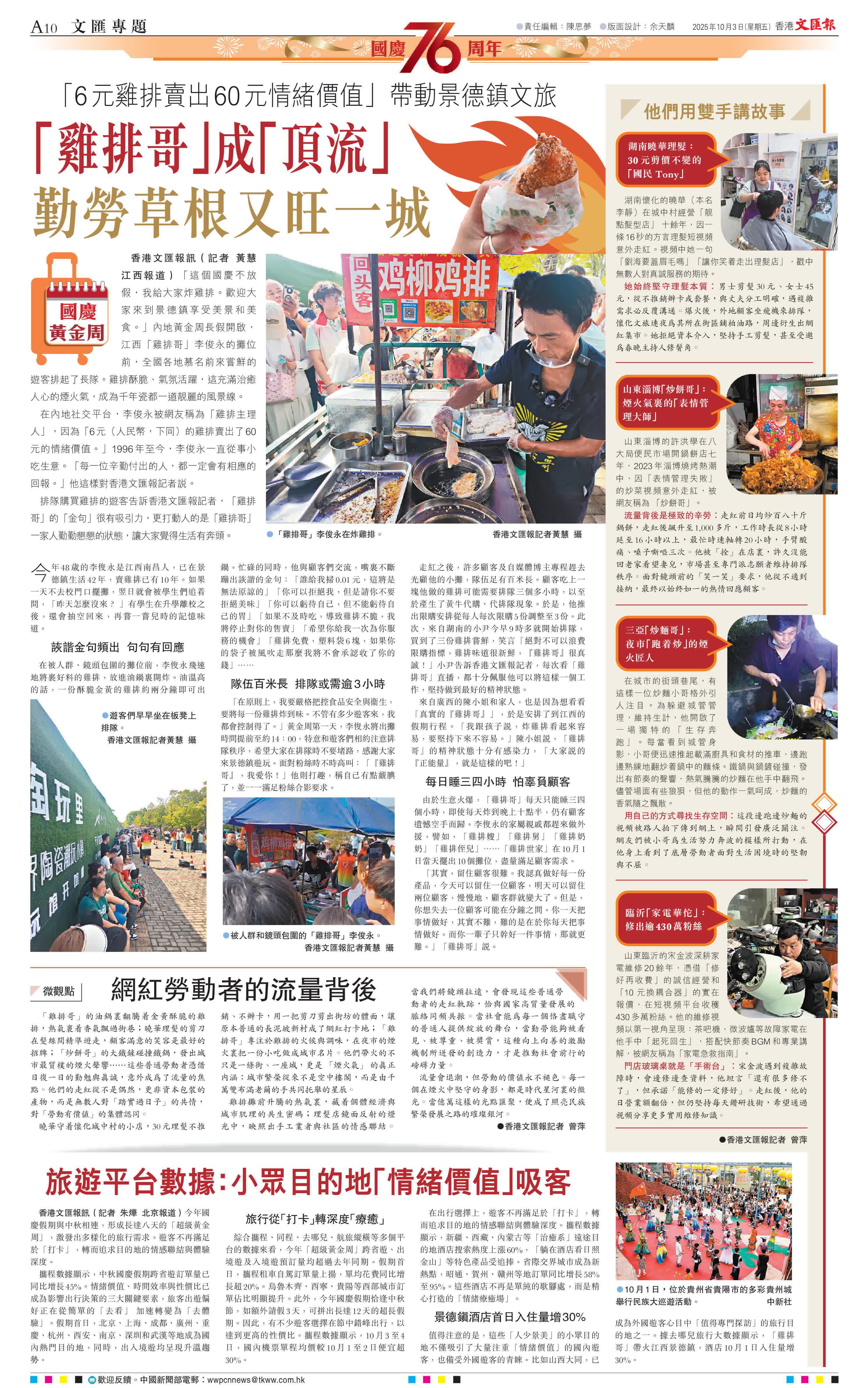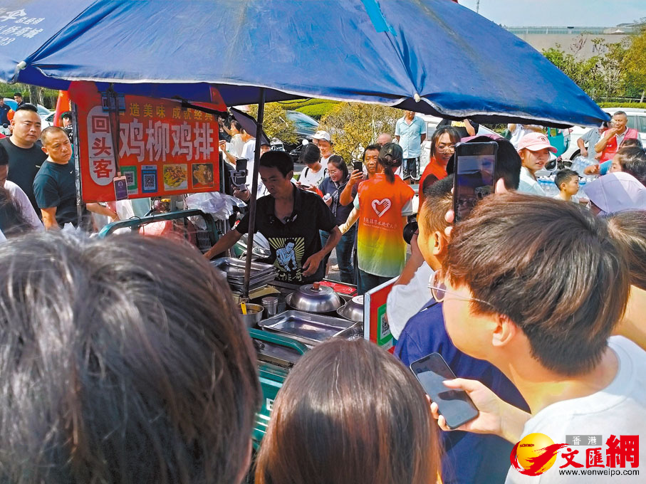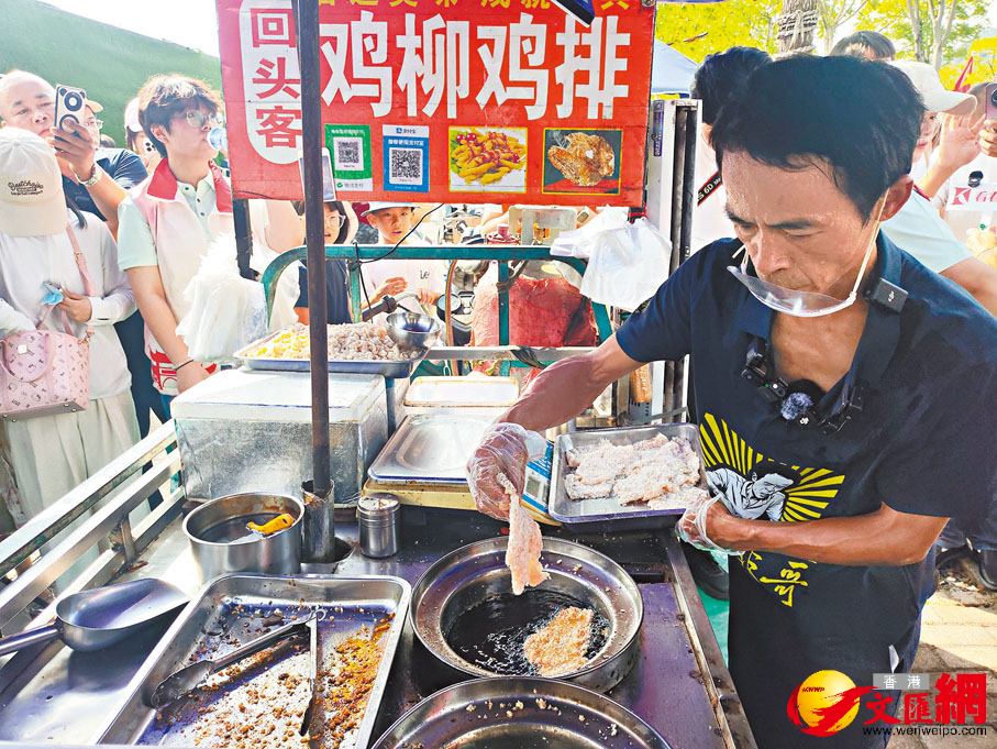 香港文匯報訊(記者 黃慧 江西報道)「這個國慶不放假,我給大家炸雞排。歡迎大家來到景德鎮享受美景和美食。」內地黃金周長假開啟,江西「雞排哥」李俊永的攤位前,全國各地慕名前來嘗鮮的遊客排起了長隊。雞排酥脆、氣氛活躍,這充滿治癒人心的煙火氣,成為千年瓷都一道靚麗的風景線。