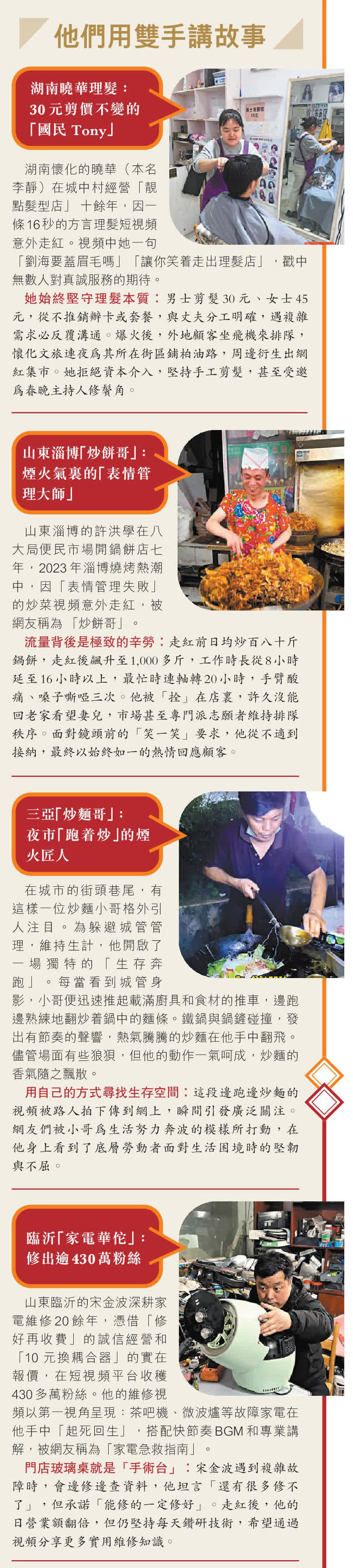 「雞排哥」的油鍋裏翻騰着金黃酥脆的雞排,熱氣裹着香氣飄過街巷;曉華理髮的剪刀在髮絲間精準遊走,顧客滿意的笑容是最好的招牌;「炒餅哥」的大鐵鏟碰撞鐵鍋,發出城市最質樸的煙火聲響……這些普通勞動者憑借日復一日的勤勉與真誠,意外成為了流量的焦點。他們的走紅從不是偶然,更非資本包裝的產物,而是無數人對「踏實過日子」的共情,對「勞動有價值」的集體認同。