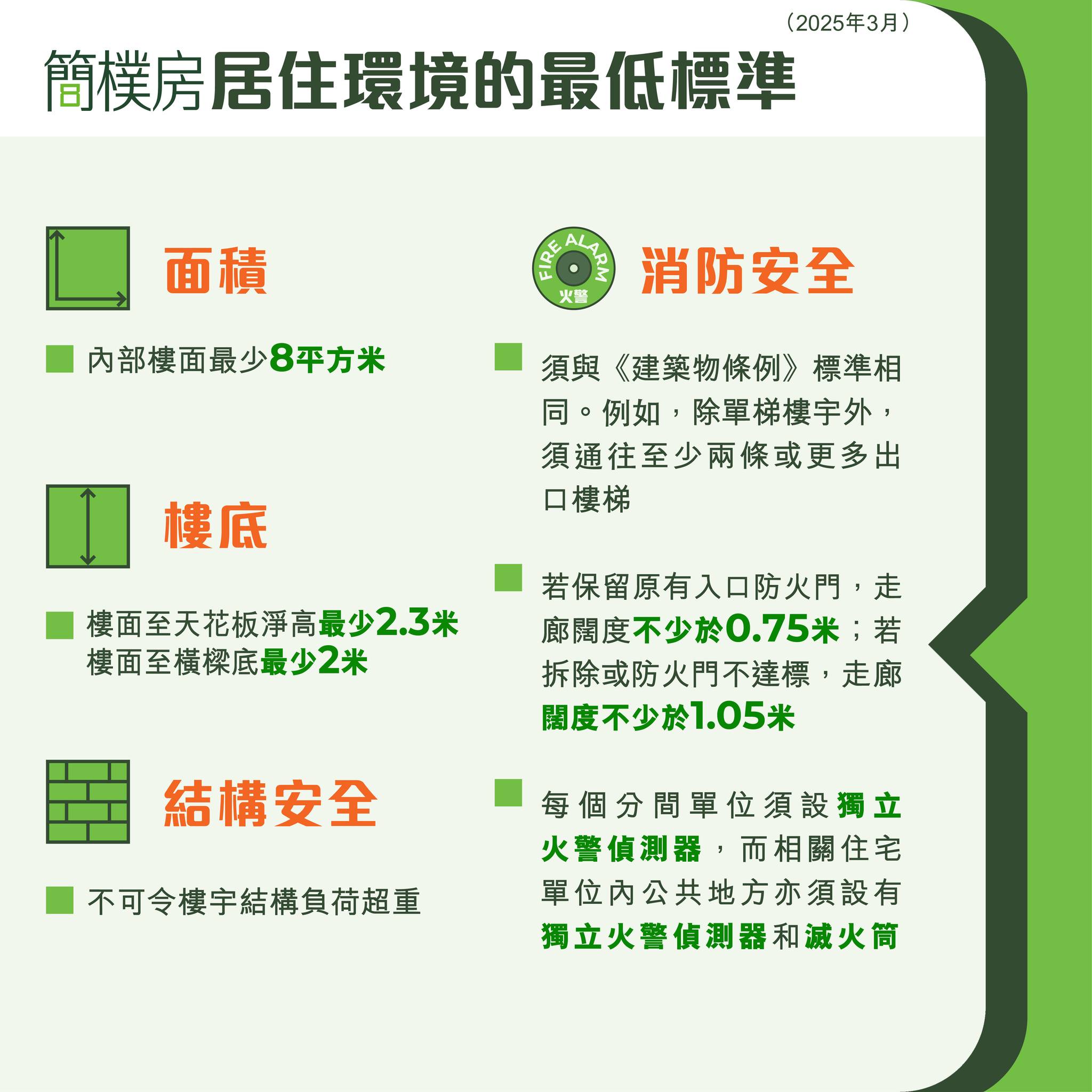 香港文匯報訊(記者 蕭景源)政府今日(3日)於憲報刊登《簡樸房條例》(《條例》),《條例》將於2026年3月1日生效,除當中有關違法出租分間單位罪行的條文則將於2027年3月1日起生效。《條例》旨在為出租住宅樓宇分間單位,由2026年3月1日起引入規管制度,即「簡樸房」規管制度,要求住宅樓宇分間單位符合居住環境的最低標準,包括最低面積、最低高度、消防安全、結構安全、獨立廁所、供水要求、照明通風,以及獨立水電錶),並取得「簡樸房」認證,方可合法出租作居住用途,以確保分間單位能提供安全、衞生和合理的居住環境。