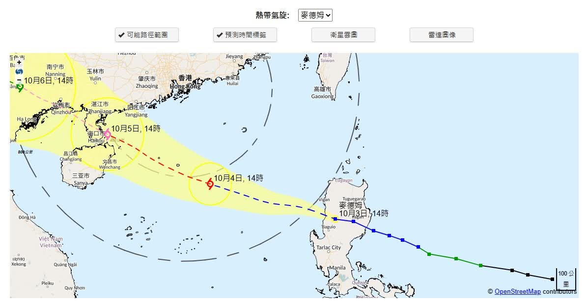 本港明日稍後(4日)至星期日(5日)天氣漸轉不穩定,風勢頗大,海有大浪及湧浪,間中有狂風驟雨。天文台會視乎麥德姆與珠江口的距離、其強度及本地風力變化,評估是否需要在明日日間改發更高熱帶氣旋警告信號。