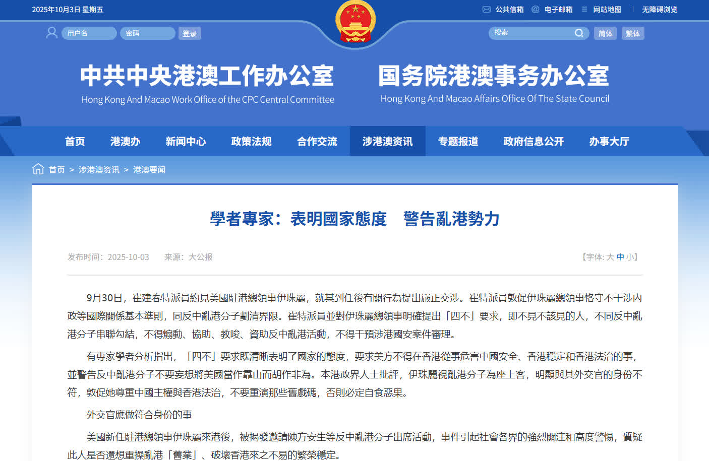 中央港澳工作辦公室、國務院港澳事務辦公室,中央政府駐港聯絡辦今日(3日)在網站轉載了《大公報》題為《學者專家:表明國家態度 警告亂港勢力》的評論文章。文章表示,有專家學者分析指出,「四不」要求既清晰表明了國家的態度,要求美方不得在香港從事危害中國安全、香港穩定和香港法治的事,並警告反中亂港分子不要妄想將美國當作靠山而胡作非為。本港政界人士批評,伊珠麗視亂港分子為座上客,明顯與其外交官的身份不符,敦促她尊重中國主權與香港法治,不要重演那些舊戲碼,否則必定自食惡果。
