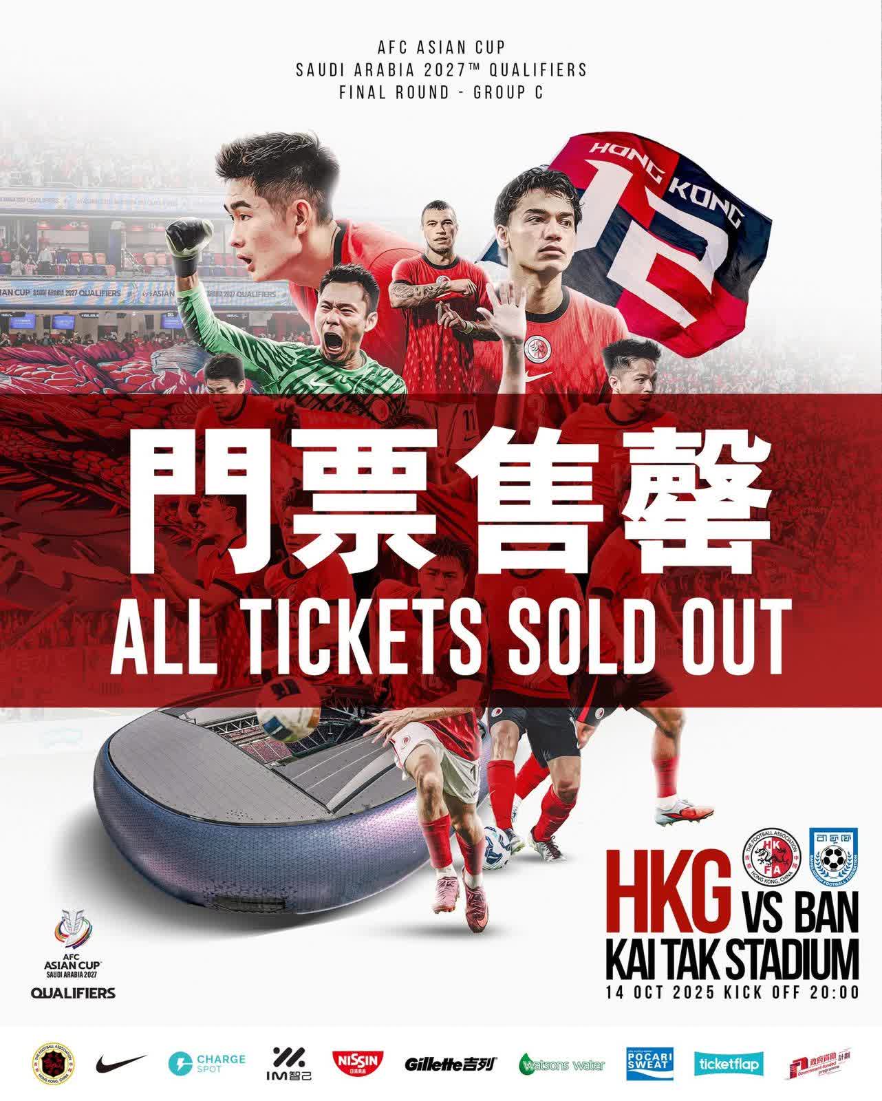 香港文匯報訊 港足將於10月14日坐鎮啟德主場館出戰亞洲盃外圍賽,對手將是孟加拉,中國香港足球總會今晚(3日)宣布,門票開售不足兩日已經售罄,意味着有望繼對印度一戰後,再次「坐爆啟德」。