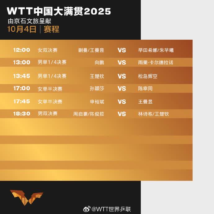 香港文匯網訊 WTT中國大滿貫2025繼續在石景山首鋼園上演。今日(4日)將進行女單半決賽、男女雙決賽等多項比賽。孫穎莎、王曼昱、林詩棟、王楚欽等人出戰。