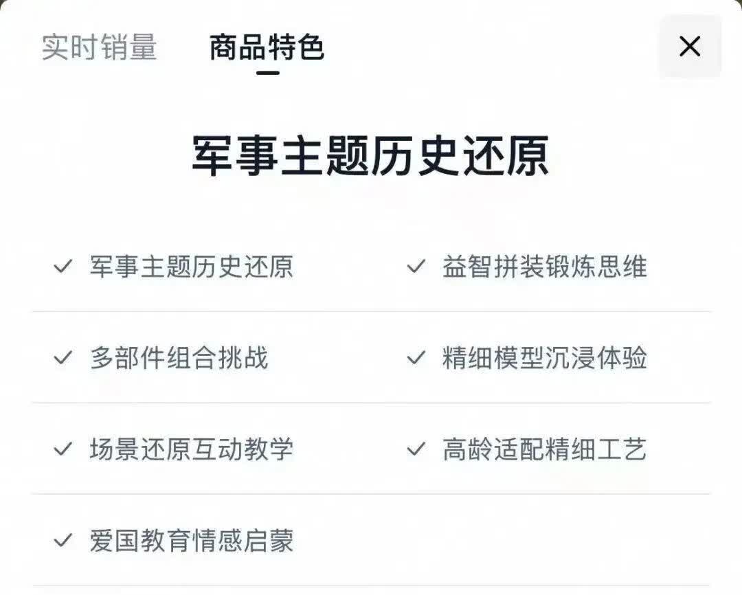 該款玩具共有8小盒,包裝盒上均被標註了「銘記歷史」字樣,還顯示具有「愛國教育情感啟蒙」,「軍事主題歷史還原」等特色。