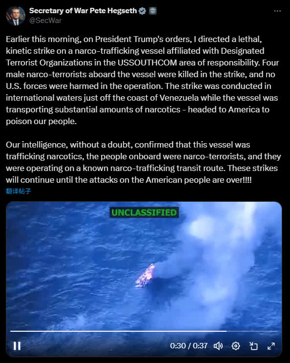 赫格塞思說,他奉總統特朗普之命指揮這次行動,並聲稱這艘船與美國政府認定為「恐怖組織」的販毒集團有關聯,船上載有準備運往美國的大量毒品。
