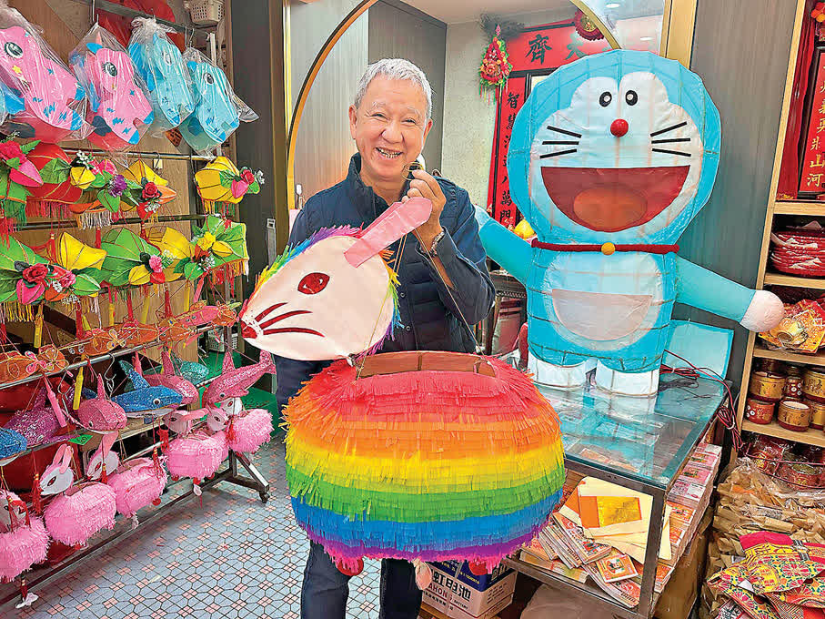 油麻地大昌隆紙號東主強哥打造近3,000隻紙紮燈籠,包括兔仔、楊桃及彩虹兔等經典款式,亦緊貼潮流推出Labubu及多啦A夢造型燈籠,至今逾半燈籠已售出。強哥女兒詹小姐表示,兔仔、楊桃及彩虹兔燈籠最受歡迎,銷售速度較去年快逾兩倍。該店早前主動調低燈籠售價,希望港人買得起、玩得開心。