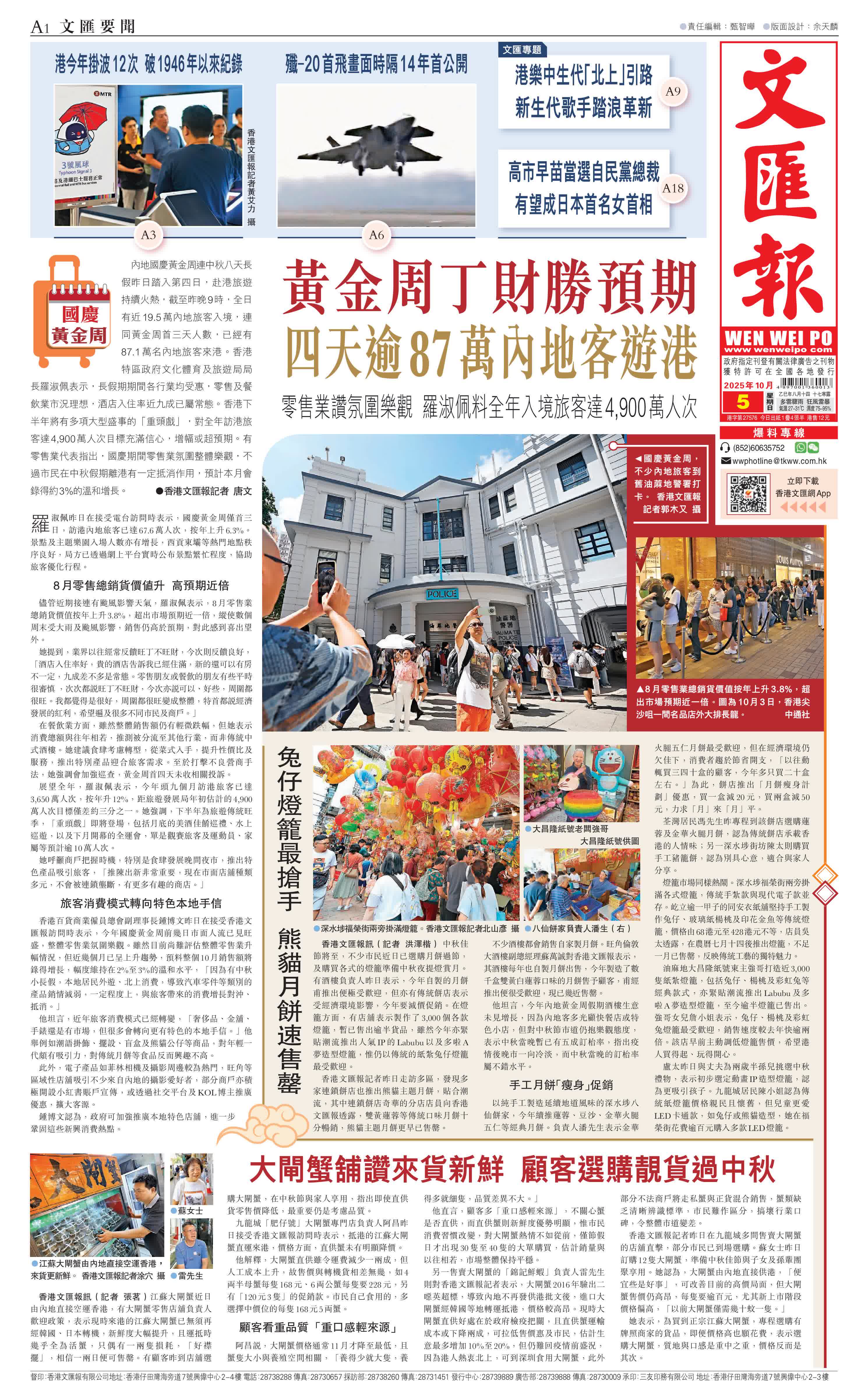 (香港文匯報記者 唐文)內地國慶黃金周連中秋八天長假昨日踏入第四日,赴港旅遊持續火熱,截至昨晚9時,全日有近19.5萬內地旅客入境,連同黃金周首三天人數,已經有87.1萬名內地旅客來港。香港特區政府文化體育及旅遊局局長羅淑佩表示,長假期期間各行業均受惠,零售及餐飲業市況理想,酒店入住率近九成已屬常態。香港下半年將有多項大型盛事的「重頭戲」,對全年訪港旅客達4,900萬人次目標充滿信心,增幅或超預期。有零售業代表指出,國慶期間零售業氛圍整體樂觀,不過市民在中秋假期離港有一定抵消作用,預計本月會錄得約3%的溫和增長。