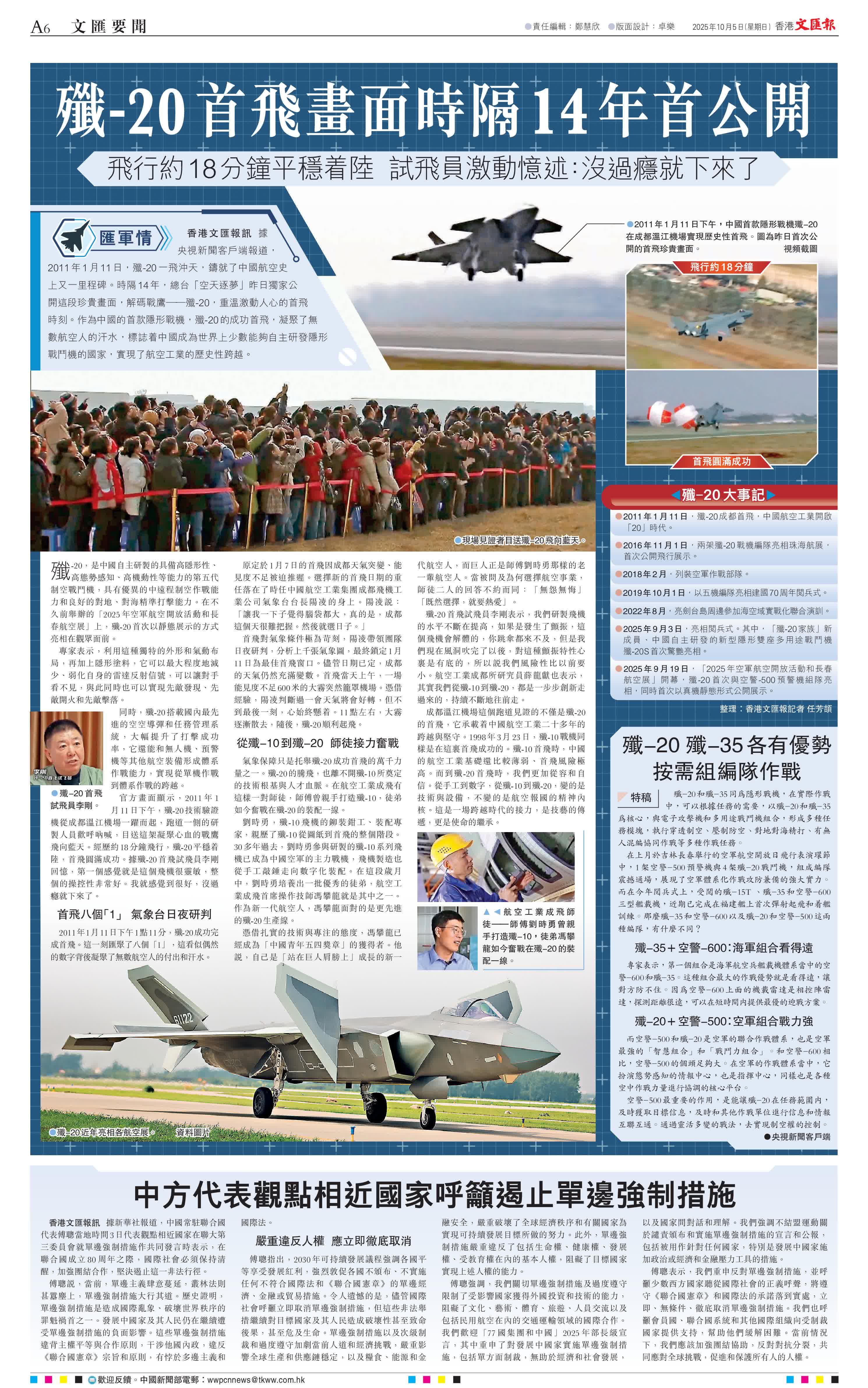 香港文匯報訊 據央視新聞客戶端報道,2011年1月11日,殲-20一飛沖天,鑄就了中國航空史上又一里程碑。時隔14年,總台「空天逐夢」昨日獨家公開這段珍貴畫面,解碼戰鷹——殲-20,重溫激動人心的首飛時刻。作為中國的首款隱形戰機,殲-20的成功首飛,凝聚了無數航空人的汗水,標誌着中國成為世界上少數能夠自主研發隱形戰鬥機的國家,實現了航空工業的歷史性跨越。