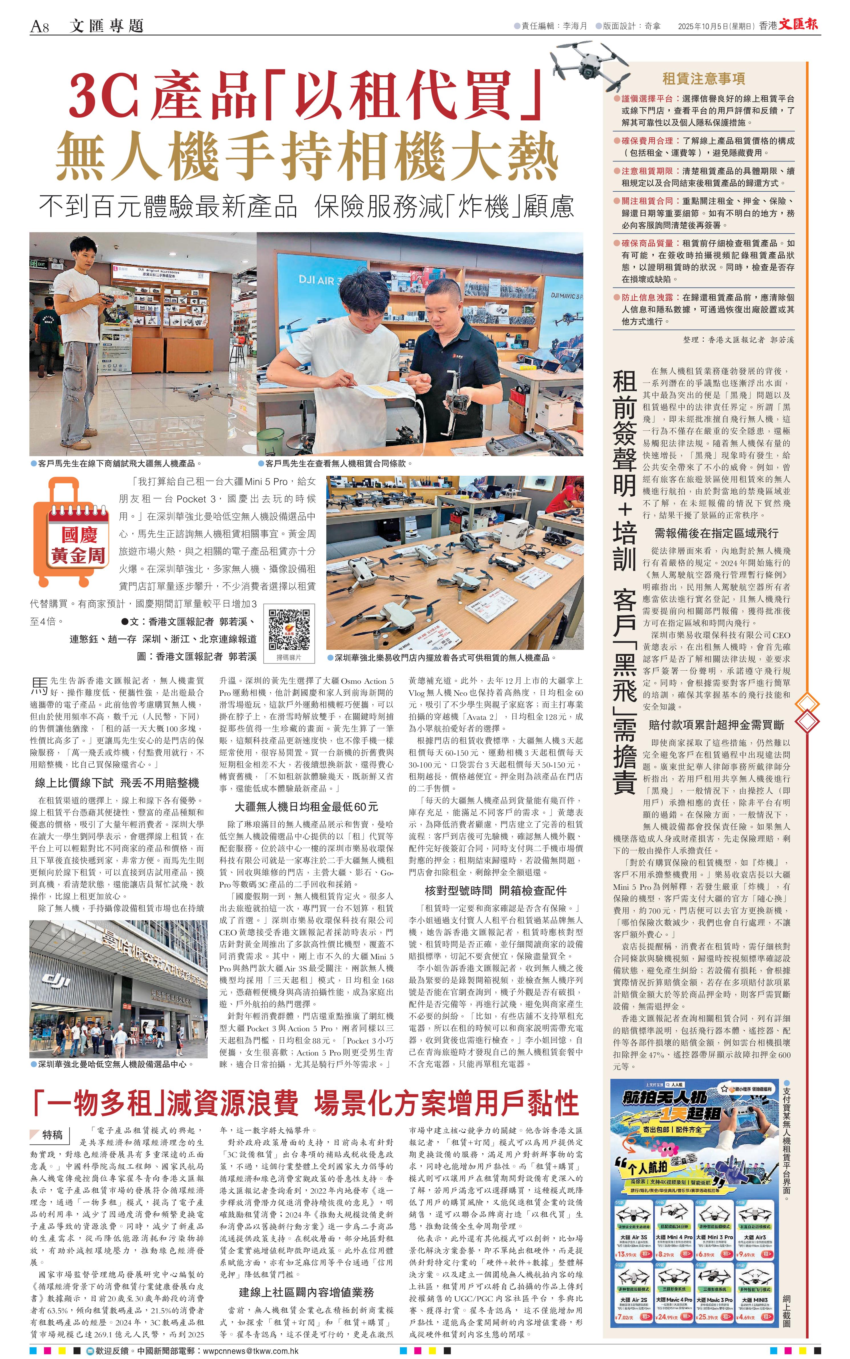 「對於有購買保險的租賃機型,如『炸機』,客戶不用承擔整機費用。」樂易收袁店長以大疆Mini 5 Pro為例解釋,若發生嚴重「炸機」,有保險的機型,客戶需支付大疆的官方「隨心換」費用,約700元,門店便可以去官方更換新機,「哪怕保險次數減少,我們也會自行處理,不讓客戶額外費心。」