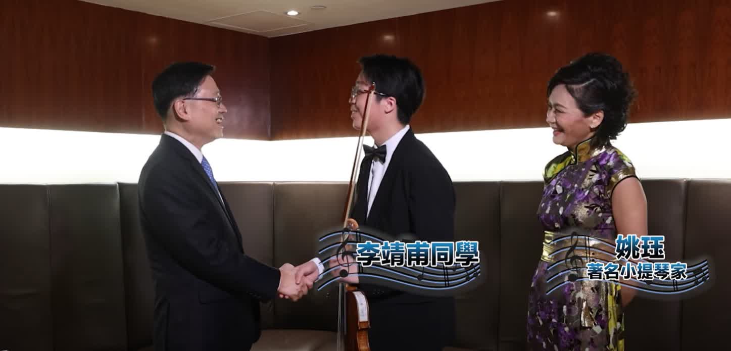 李家超指,2022年,上任行政長官首月,到深水埗區探訪來自基層「劏房」家庭的李同學,當時他在家中為他們演奏小提琴,並向其談及他的小提琴夢,「時隔3年,我再見到李同學時,他已是在國慶文藝晚會中,踏上了紅館舞台,與著名小提琴家姚珏和香港弦樂團同台演出,演奏跨界作品《粵劇幻想曲》,令我非常驚喜。」
