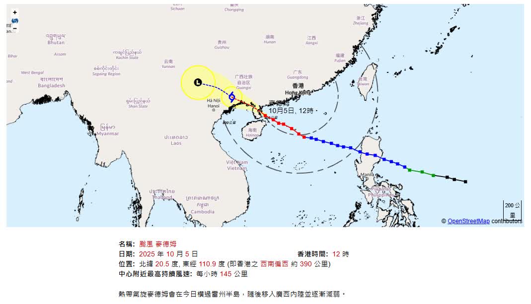 在今日正午12時,颱風麥德姆集結在香港之西南偏西約390公里,預料向西北偏西移動,時速約22公里,移向雷州半島。過去數小時,麥德姆穩定地繼續遠離本港。本地風力開始稍為減弱,但部分地區仍然受強風影響,離岸及高地間中吹烈風。
