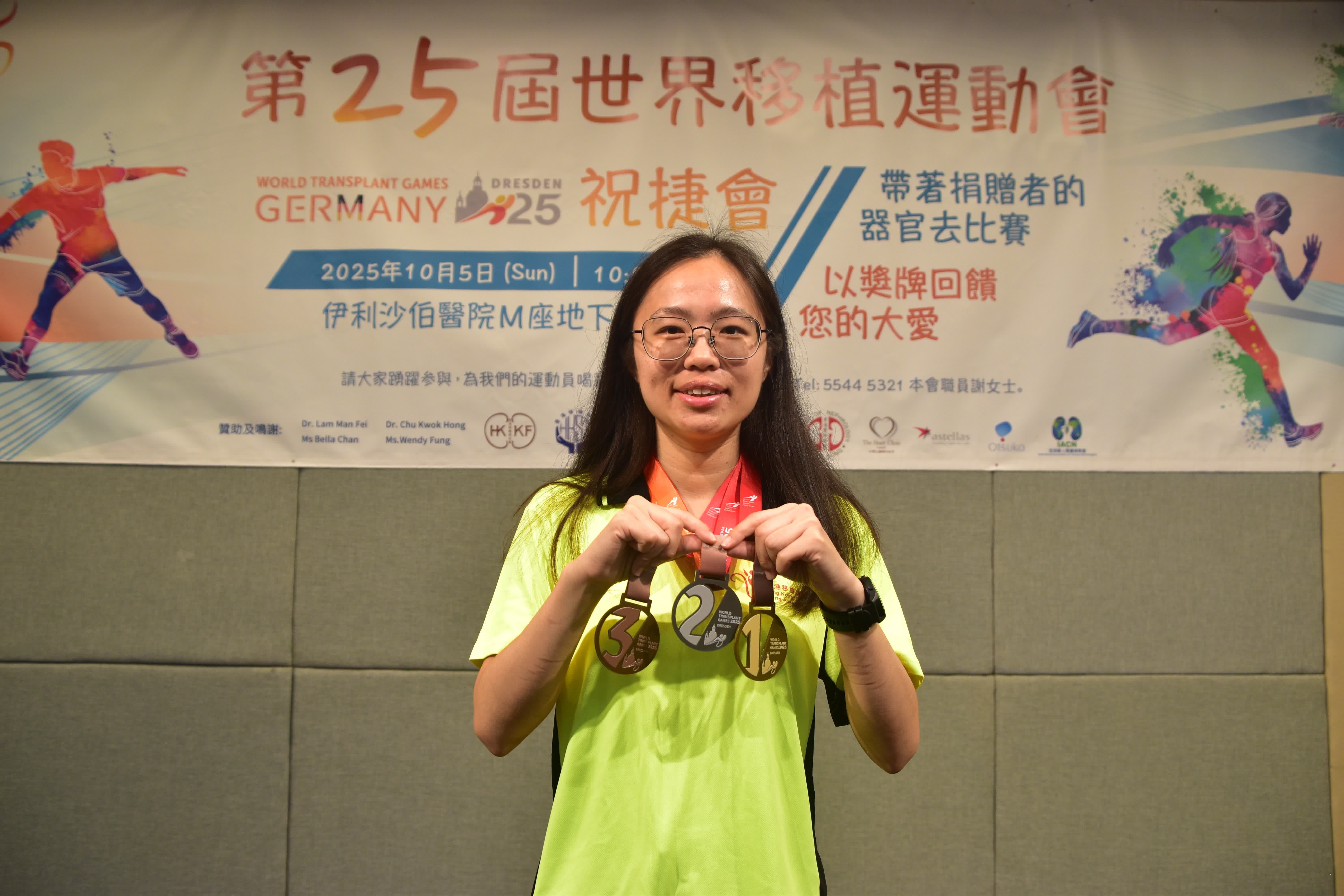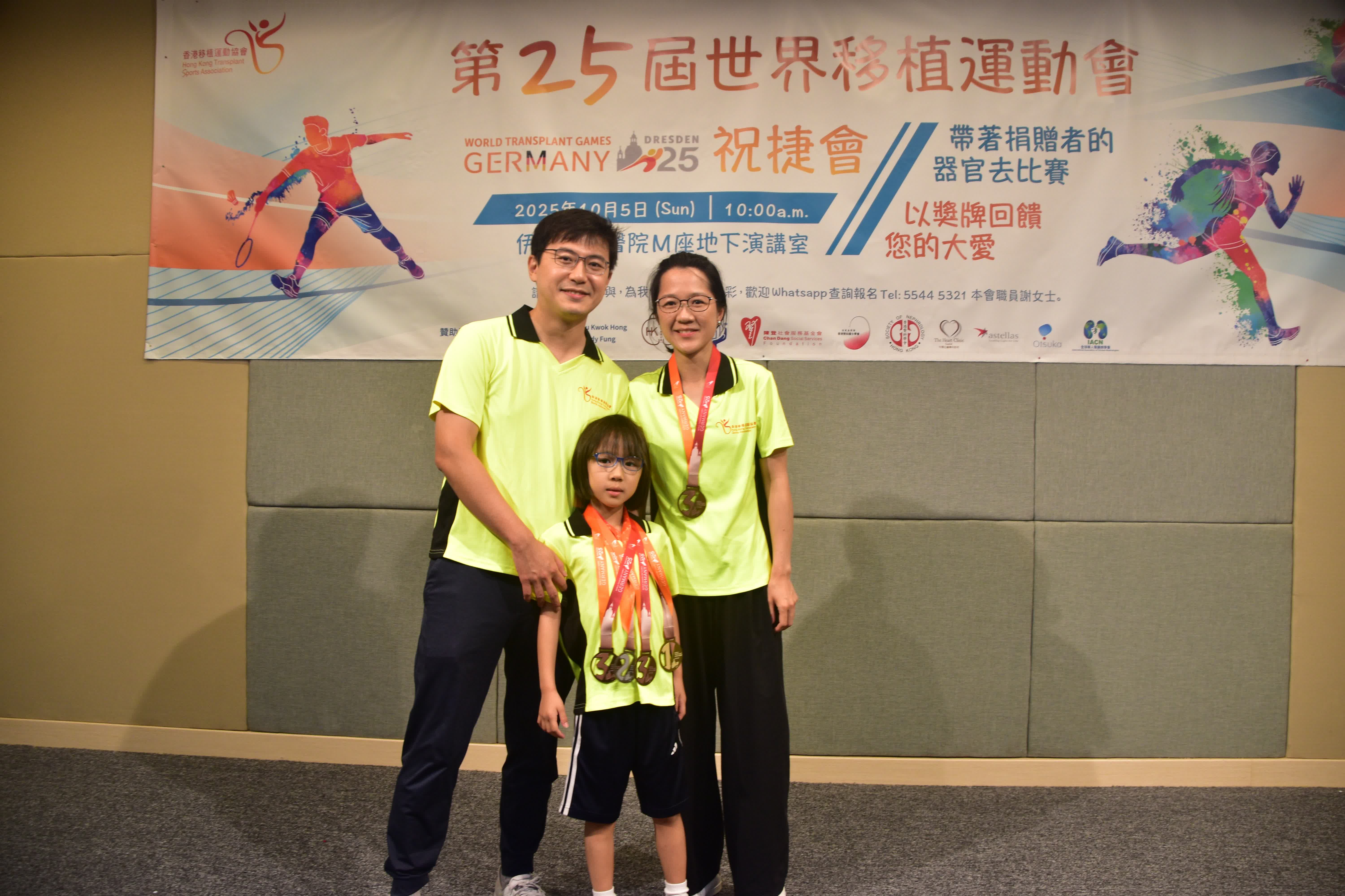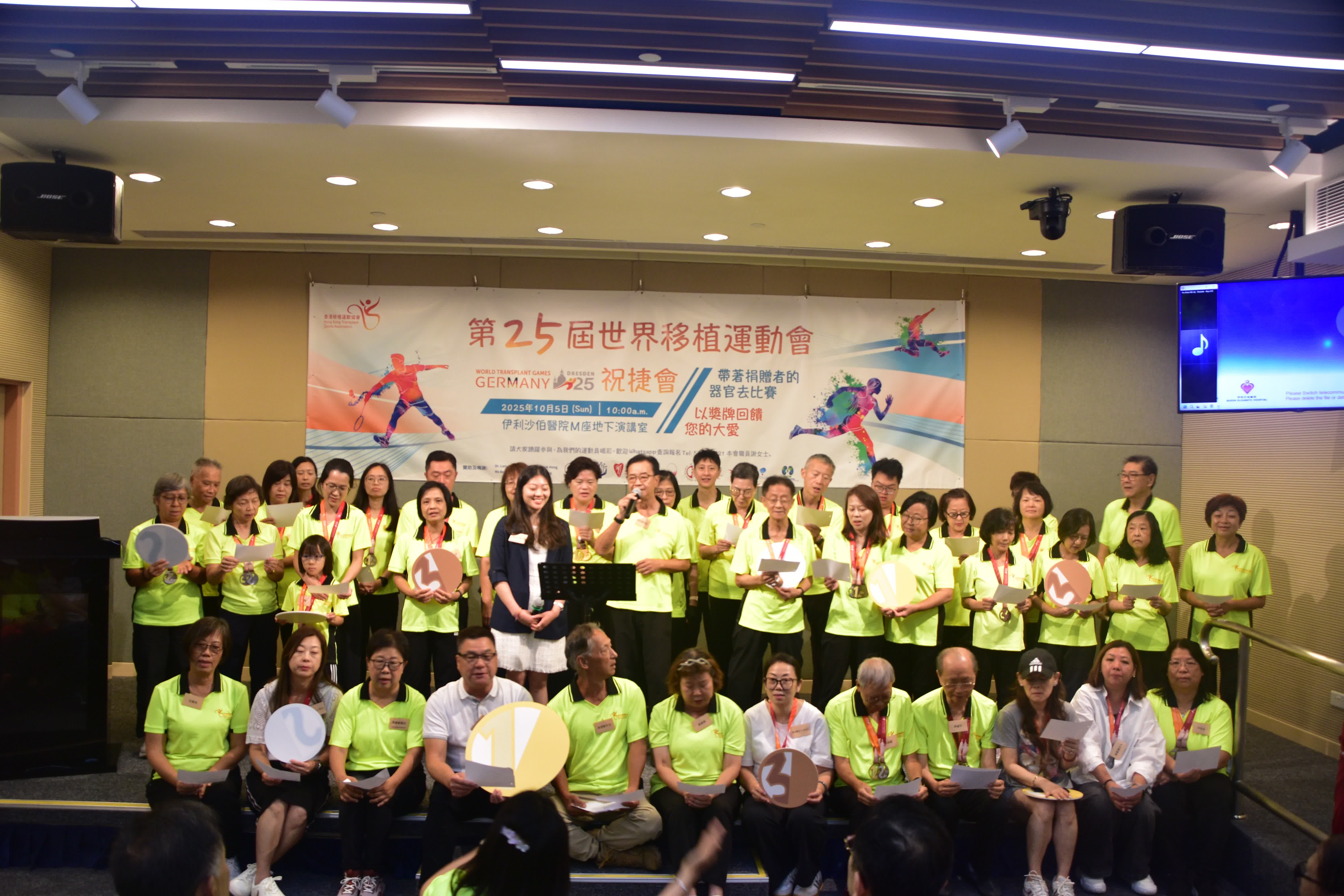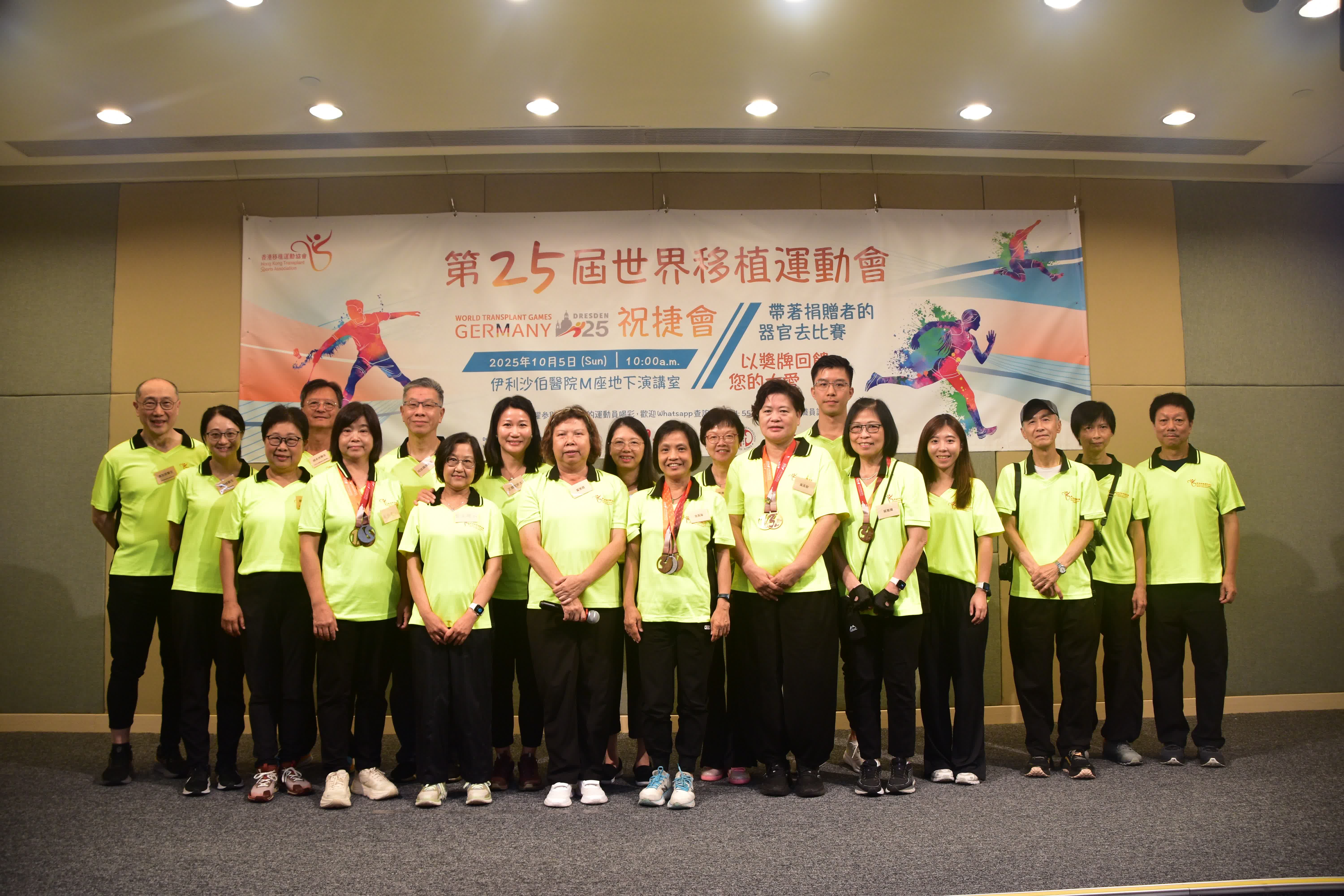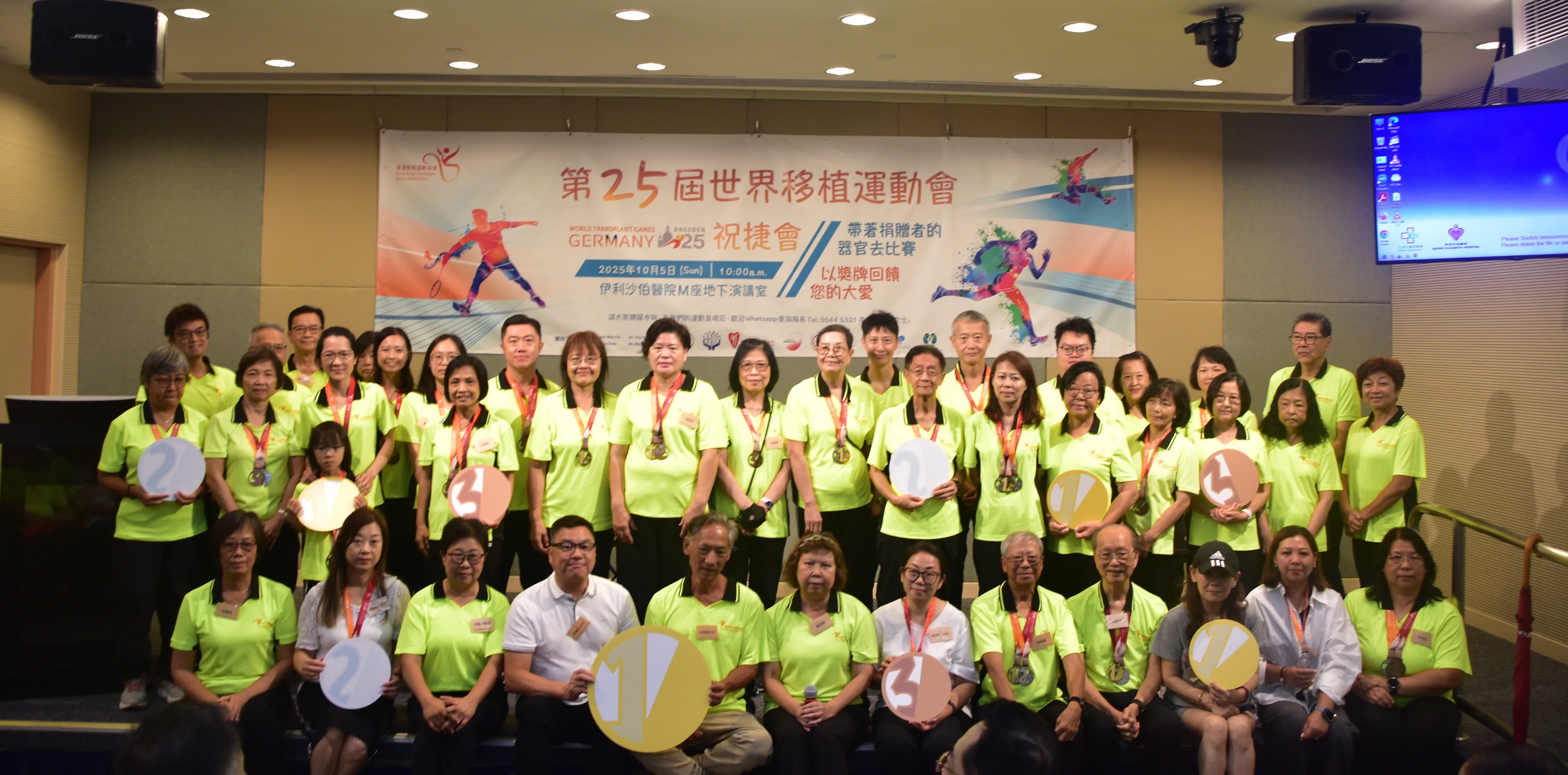 祝捷大會以「帶著捐贈者的器官去比賽 以獎牌回饋您的大愛」為主題,衞生署署長林文健、醫管局聯網服務總監王耀忠及香港移植運動協會贊助人梁智鴻出席擔任主禮嘉賓,共同見證運動員的感恩與喜悅。