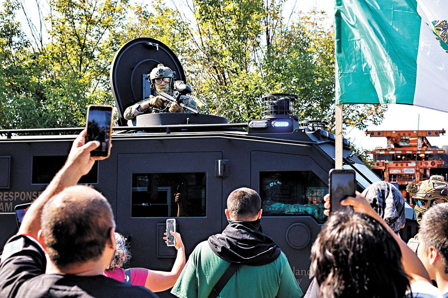 香港文匯報訊 美國芝加哥近日爆發連串抗議活動,反對聯邦移民和海關執法局(ICE)執法,當地時間上周六(10月4日)爆發衝突。多間美媒報道,一批抗議者駕車撞向ICE特工的車輛,特工下車開槍,擊傷一名持槍的女子。總統特朗普迅速以此為藉口,頒令派遣300名國民警衛隊成員進駐芝加哥,揚言保護當地官員及相關設施,令芝加哥成為特朗普與當地民主黨官員衝突升級的又一戰場。
