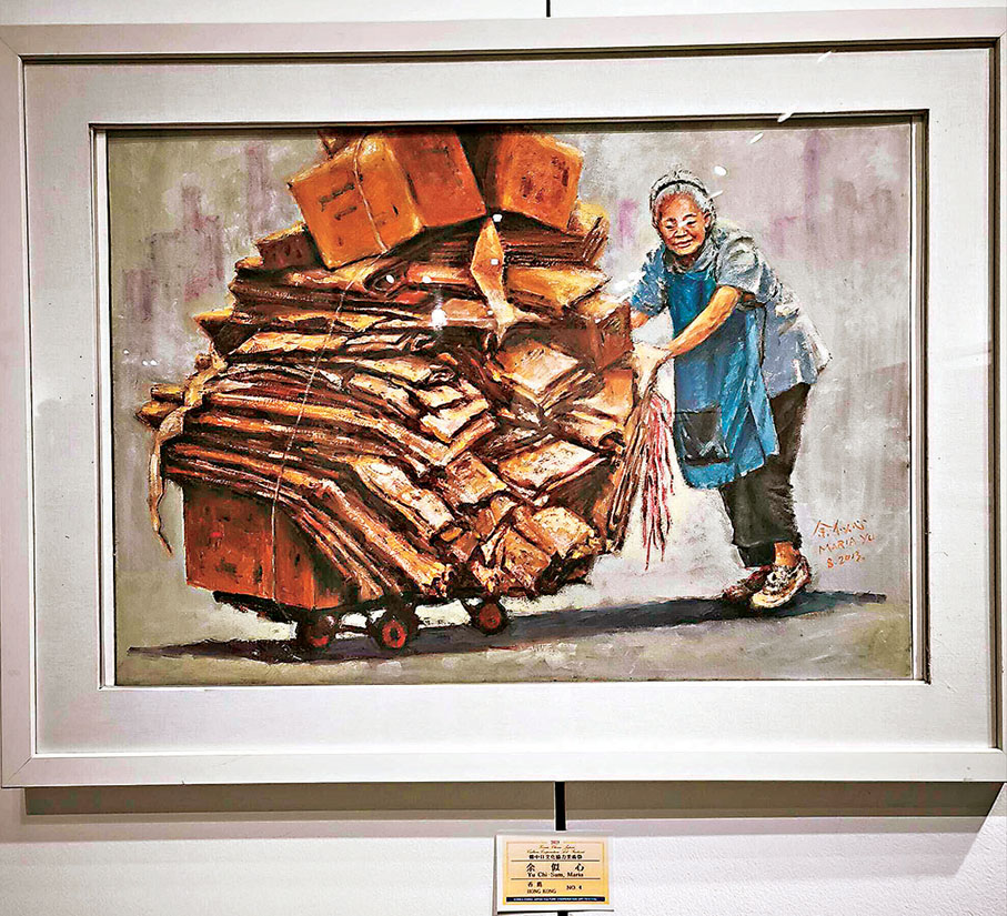 現場以3種語言即時傳譯,不過,藝術的另一個境界是不用語言、文字的,透過色彩與線條便能表達出動人心弦無分國界的情懷。我今次參展的作品是一幅老婦人推着堆滿紙皮的手推車,這是香港街頭常見的現象,有些長者寧可拾紙皮變賣換生計,也不申請政府援助,這是一份「香港精神」,我想將之帶出香港,讓更多人認識。