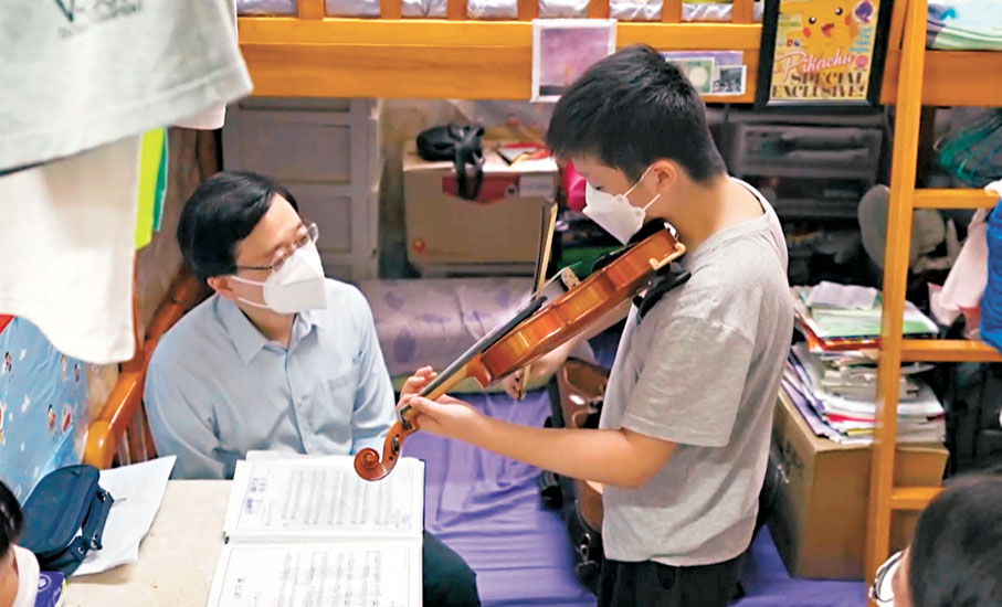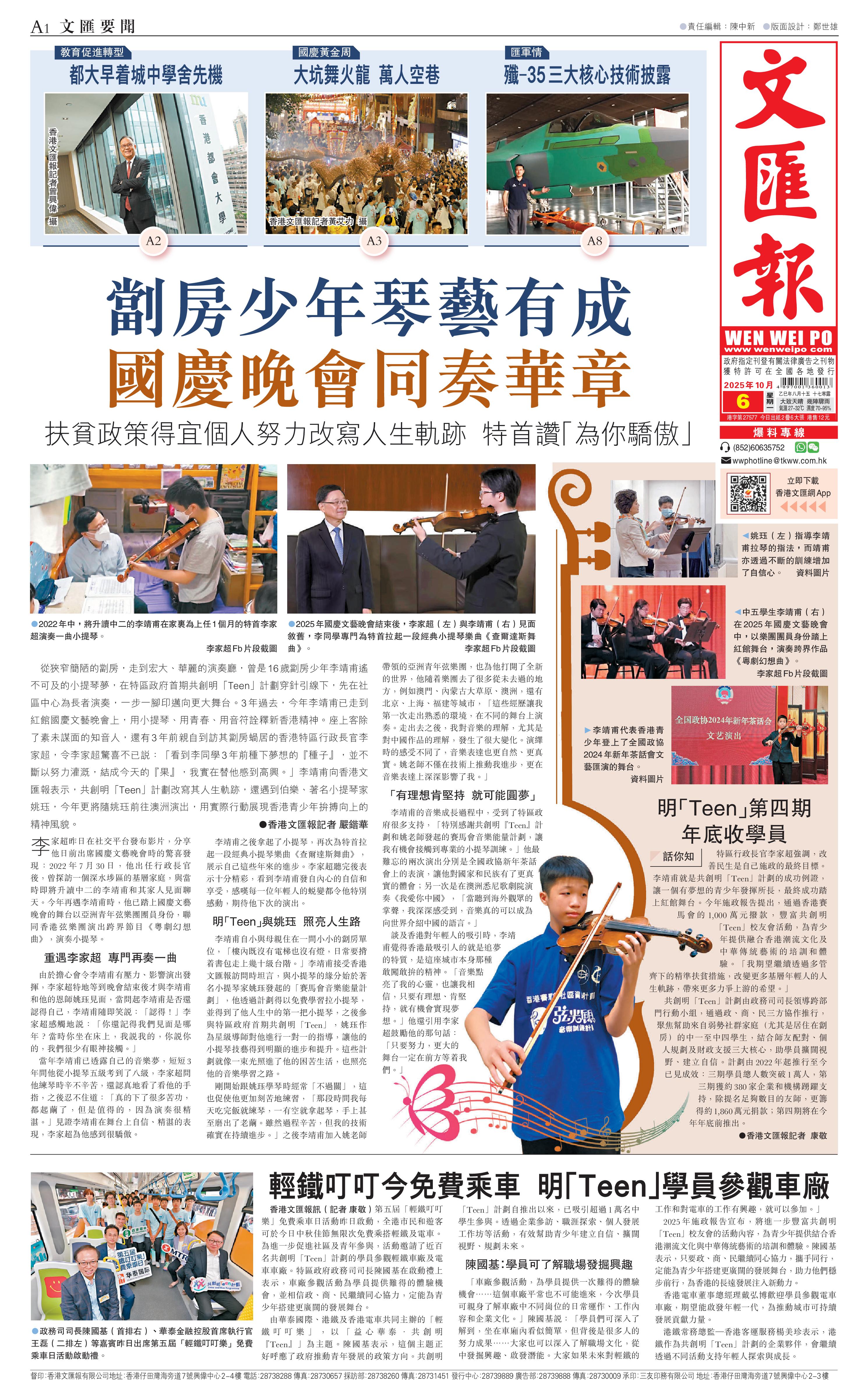 (香港文匯報記者 嚴鍇華)從狹窄簡陋的劏房,走到宏大、華麗的演奏廳,曾是16歲劏房少年李靖甫遙不可及的小提琴夢,在特區政府首期共創明「Teen」計劃穿針引線下,先在社區中心為長者演奏,一步一腳印邁向更大舞台。3年過去,今年李靖甫已走到紅館國慶文藝晚會上,用小提琴、用青春、用音符詮釋新香港精神。座上客除了素未謀面的知音人,還有3年前親自到訪其劏房蝸居的香港特區行政長官李家超,令李家超驚喜不已說:「看到李同學3年前種下夢想的『種子』,並不斷以努力灌溉,結成今天的『果』,我實在替他感到高興。」李靖甫向香港文匯報表示,共創明「Teen」計劃改寫其人生軌跡,還遇到伯樂、著名小提琴家姚珏,今年更將隨姚珏前往澳洲演出,用實際行動展現香港青少年拚搏向上的精神風貌。