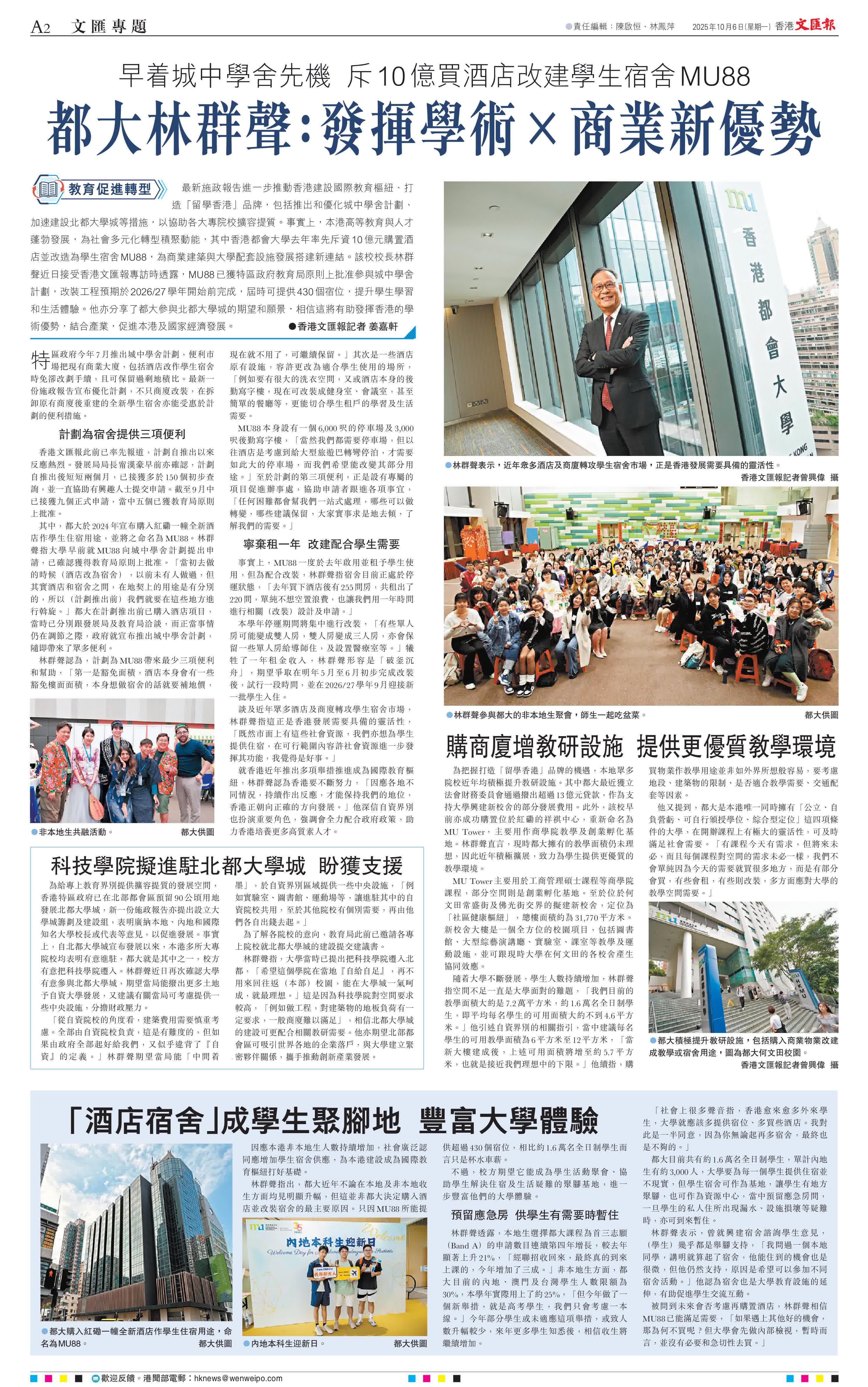 (香港文匯報記者 姜嘉軒)最新施政報告進一步推動香港建設國際教育樞紐、打造「留學香港」品牌,包括推出和優化城中學舍計劃、加速建設北都大學城等措施,以協助各大專院校擴容提質。事實上,本港高等教育與人才蓬勃發展,為社會多元化轉型積聚動能,其中香港都會大學去年率先斥資10億元購置酒店並改造為學生宿舍MU88,為商業建築與大學配套設施發展搭建新連結。該校校長林群聲近日接受香港文匯報專訪時透露,MU88已獲特區政府教育局原則上批准參與城中學舍計劃,改裝工程預期於2026/27學年開始前完成,屆時可提供430個宿位,提升學生學習和生活體驗。他亦分享了都大參與北都大學城的期望和願景,相信這將有助發揮香港的學術優勢,結合產業,促進本港及國家經濟發展。
