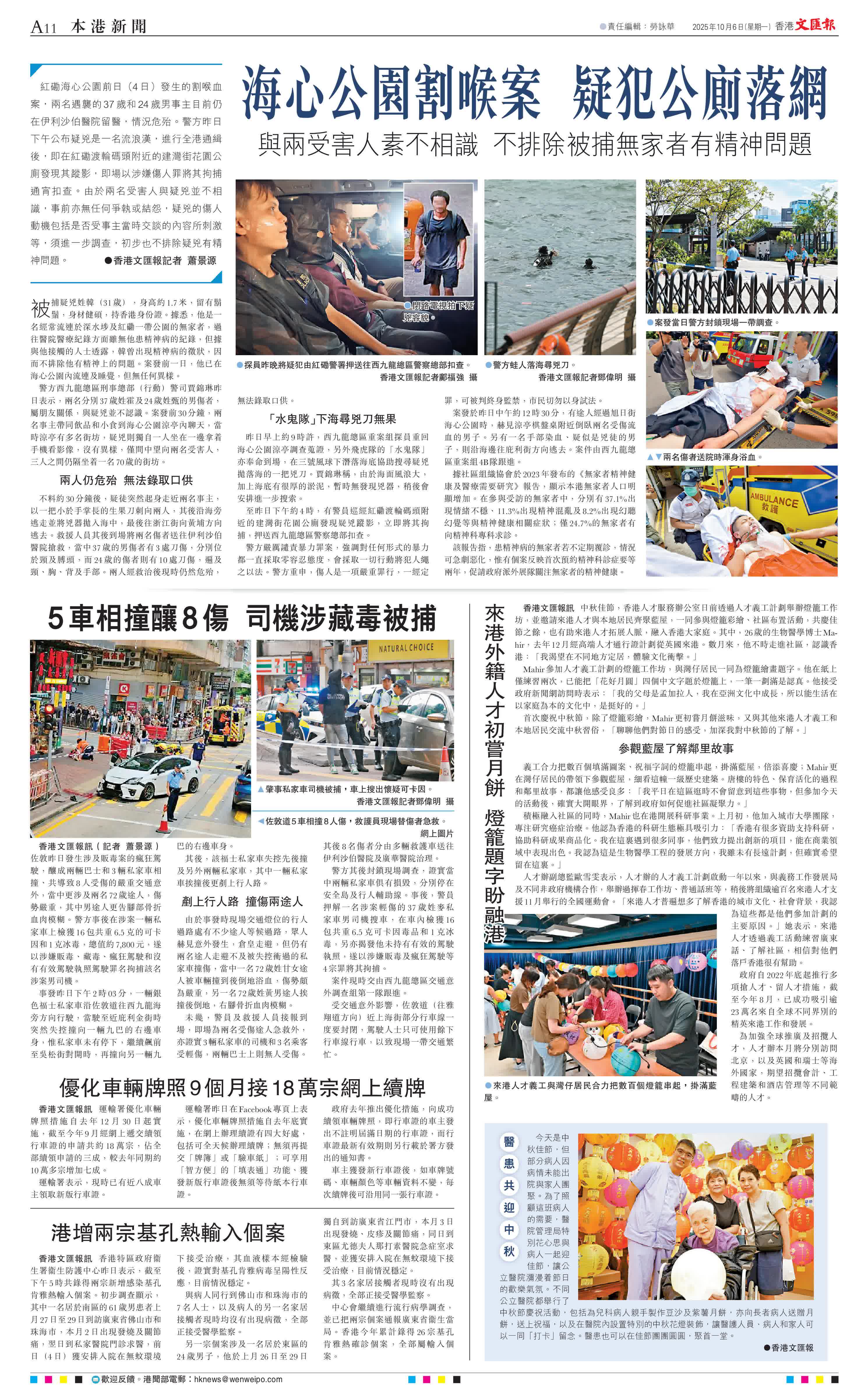 警方西九龍總區刑事總部(行動)警司賈錦琳昨日表示,兩名分別37歲姓霍及24歲姓甄的男傷者,屬朋友關係,與疑兇並不認識。案發前30分鐘,兩名事主帶同飲品和小食到海心公園涼亭內聊天,當時涼亭有多名街坊,疑兇則獨自一人坐在一邊拿着手機看影像,沒有異樣,僅間中望向兩名受害人,三人之間仍隔坐着一名70歲的街坊。