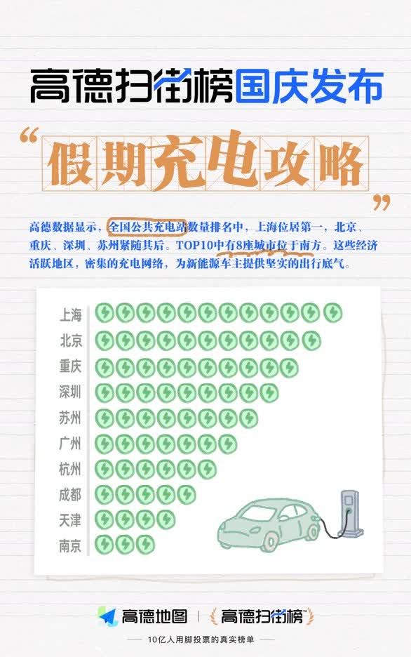 在全國公共充電站數量排名中,上海位居第一,北京、重慶、深圳、蘇州緊隨其後,南方城市佔據TOP10中的8席。這些經濟活躍地區,密集的充電網絡,為新能源車主提供堅實的出行底氣。