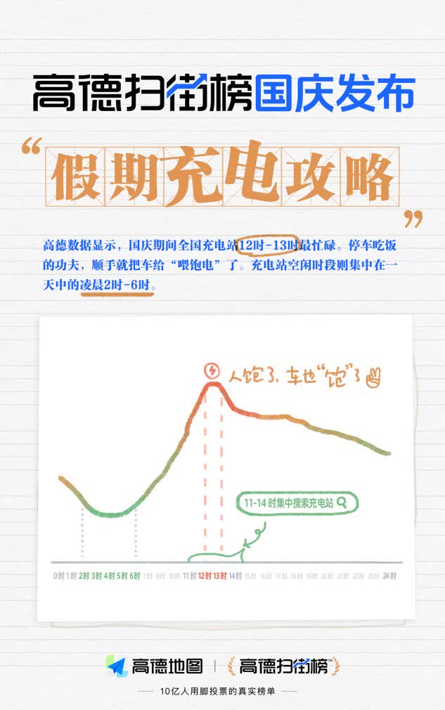高德數據顯示,國慶首日全國充電站日均搜索用戶數同比增長42%,創同期新高,反映出新能源汽車用戶的活躍度顯著提升,節假日綠色出行已成為主流趨勢之一。此外,搜索充電站的高發時段是11時-14時。全國充電站最繁忙時段主要集中在12時-13時,恰與午飯時間重合,停車吃飯的功夫也順便給車輛「餵飽電」。充電站空閑時段集中在一天中的凌晨2時-6時。