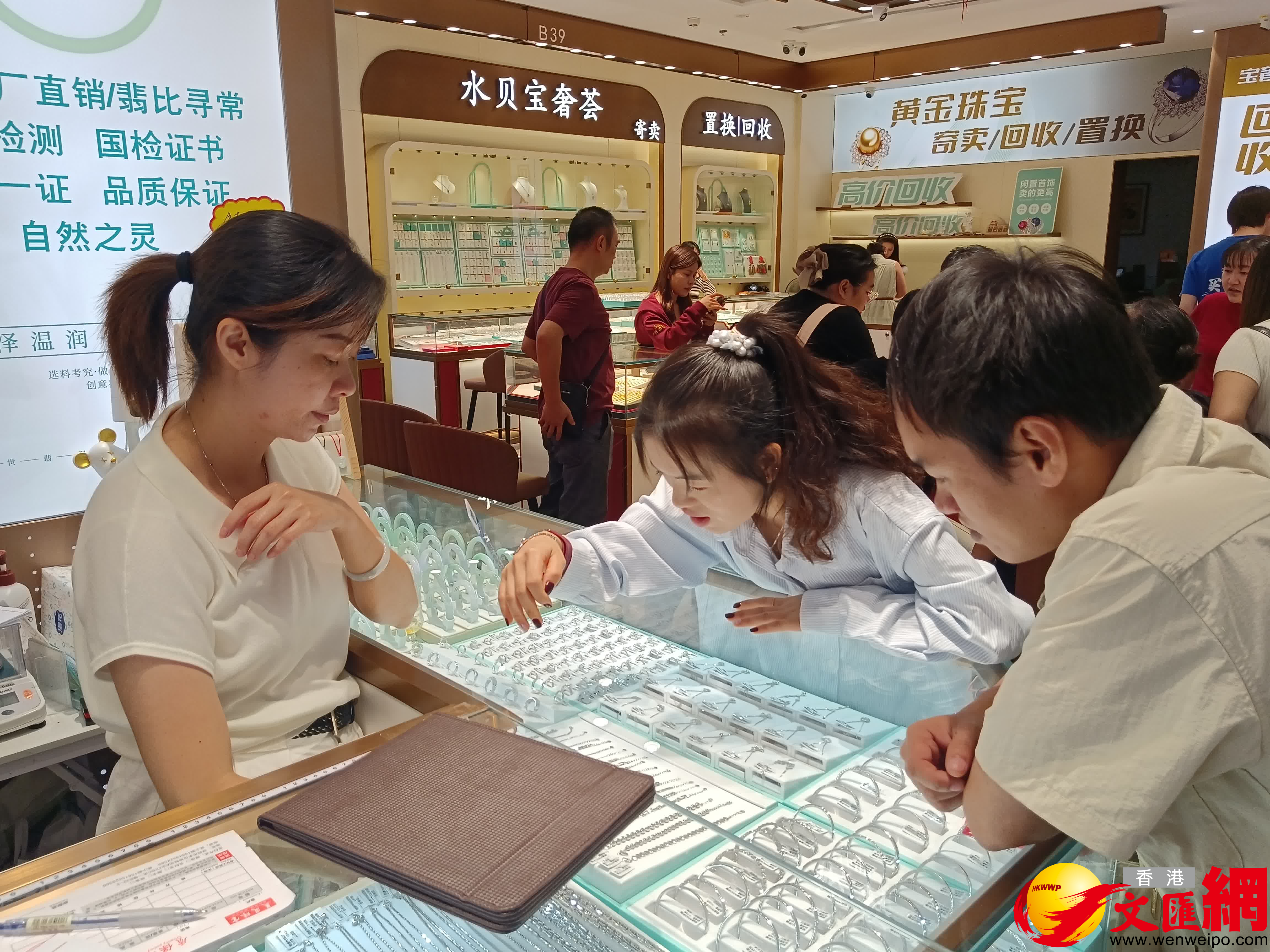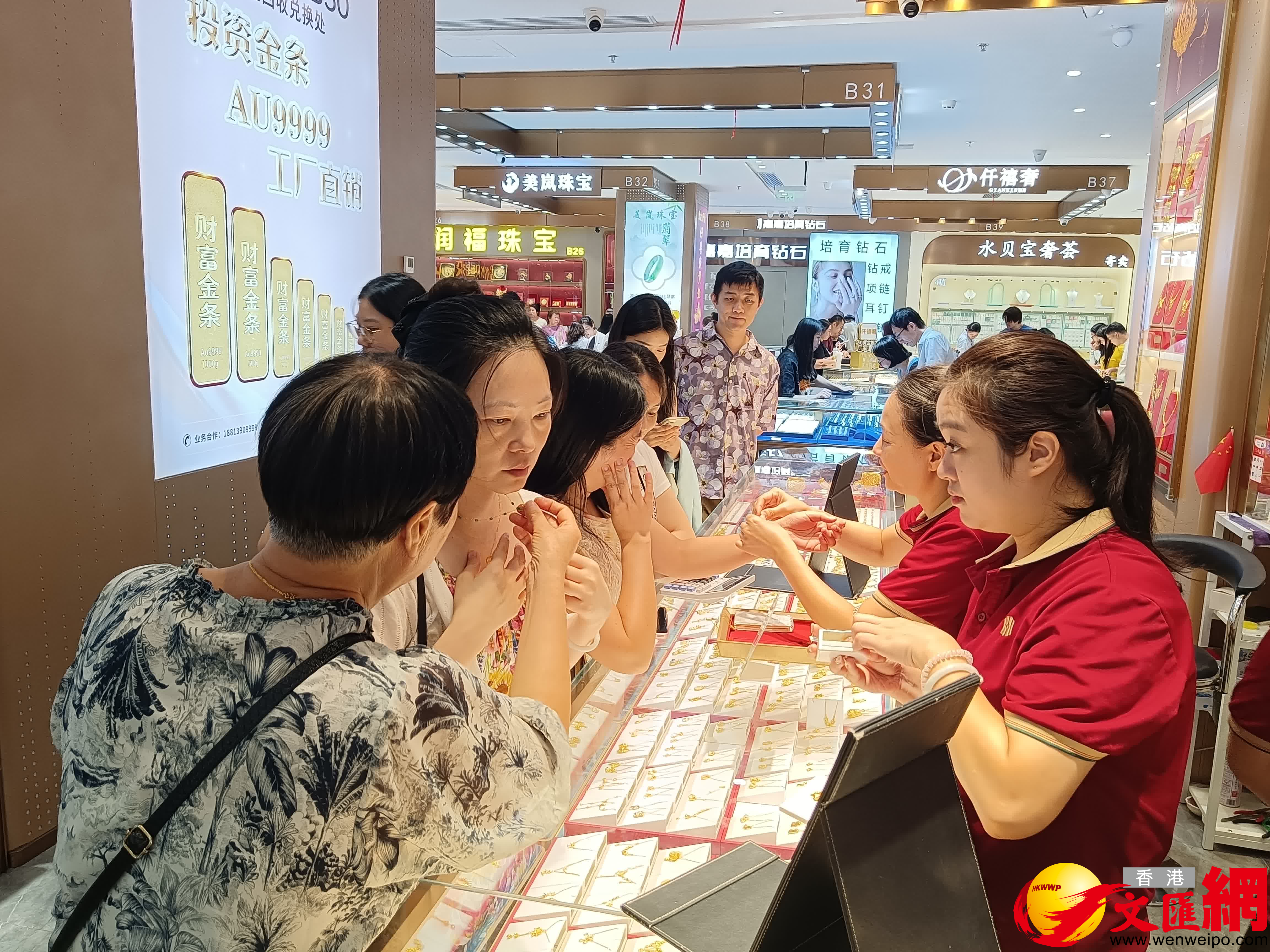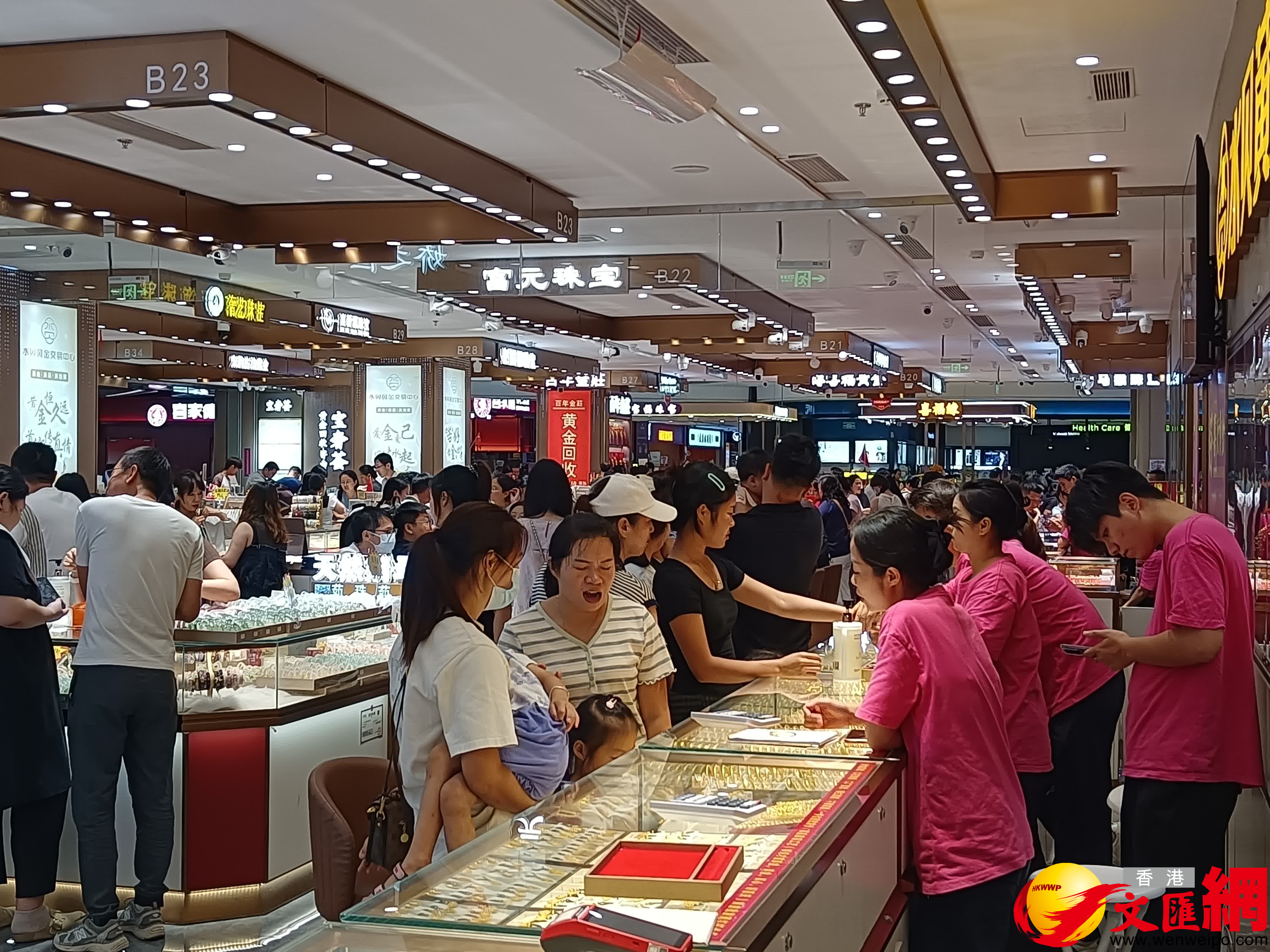 記者下午在全國著名的黃金交易中心深圳水貝黃金交易中心看到市場人頭攢動,大量全國各地遊客來香港和深圳旅遊之際前來購買黃金和金條等。有商家表示,國慶假期平均一天銷售100克黃金產品,有的則有200-300克,較平時增長好幾成。客戶購買的主要是黃金飾品為吊墜、項鏈、手鐲和金條等,價格從數千元到五六萬元不等。多數用戶是用於婚慶,部分是自用兼投資,等金價上漲一定幅度再變賣賺錢。