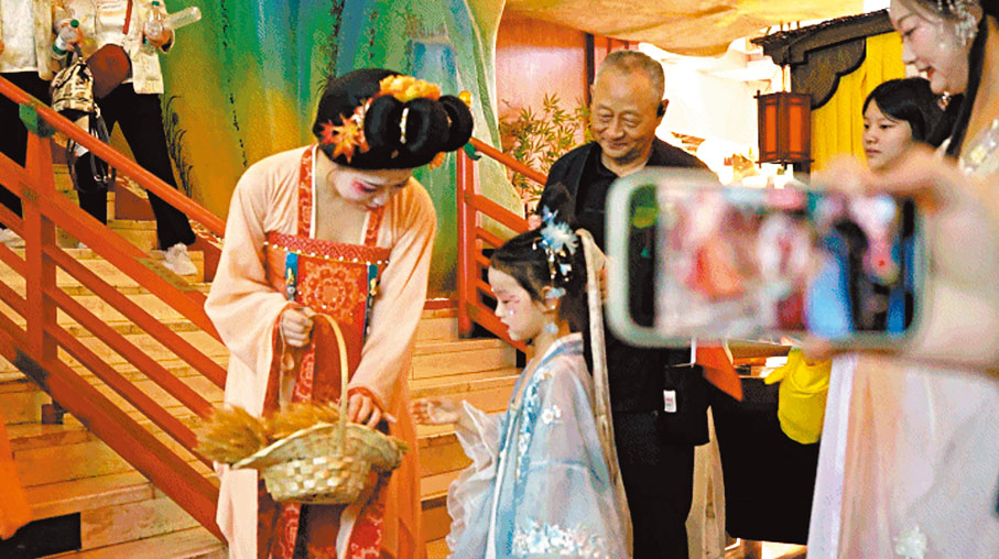 「賞月、巡遊、對詩、吃月餅,然後『對酒當歌』才算完美。」陳芸告訴記者,中秋夜一定要感受一回盛唐飲食裏的儀式感。進入「樂宴盛唐」,陳芸就像闖進了唐代的宮宴,教坊司樂師奏樂迎賓,仕女引路奉茶,此時此刻,她感覺自己已不是遊客,而是赴宴的盛唐賓客。「整個宴飲過程中,不僅有戲劇、舞蹈、器樂、特效與互動的全方位感官體驗,而且還能在席間與『李白』對詩,跟『陸羽』談茶、和大唐官員學禮,甚至還有遊客被『聖人』點名『賜座』。」同時,宮宴復刻唐時宴席分餐制,席間一人一套包含「茗」「酥」「鮮」「烹」「炙」「甘」「珍」「豐」8組佳餚。陳芸感慨說,賞心悅目的美食,每一口都是盛唐中秋的味道。