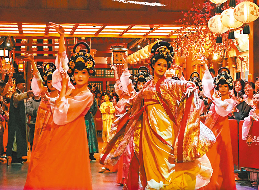 長裙飄飄的唐裝少女和步履輕盈的翩翩公子,手提花燈漫步盛唐街市不期而遇的月宮仙子,手執摺扇對月吟詩的詩仙「李白」……10月6日中秋佳節晚6時,踏入位於陝西西安大雁塔之南的長安十二時辰主題街區,彷彿瞬間穿越回到了一千多年前的大唐長安城中秋夜。據了解,長安十二時辰主題街區以數智化賦能沉浸式體驗,為遊客構建出一個虛實交織、可感可觸的唐風世界,遊客如古人一般賞月、巡遊、對詩、吃月餅、享受宮宴,在與演員NPC互動中,感受古人過節的儀式感。「中秋節是萬家團圓的日子,也承載着千年文化的溫情與詩意。」●文:香港文匯報記者 李陽波 西安報道 圖:香港文匯報西安傳真