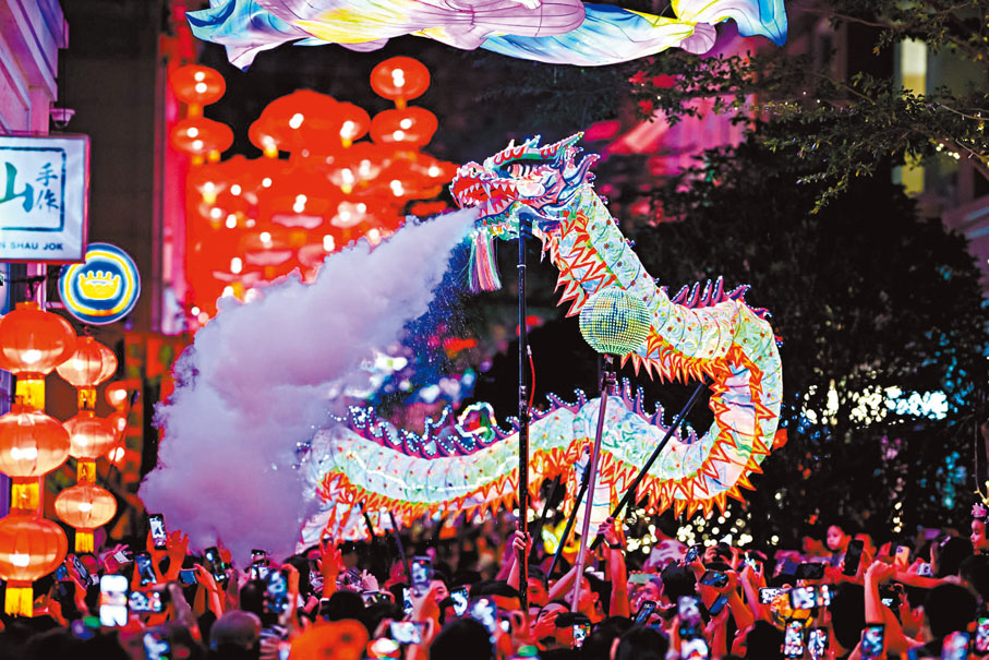 灣仔利東街舉行LED火龍舞鼓賀中秋,街道滿掛800盞燈籠。●香港文匯報記者 洪澤楷