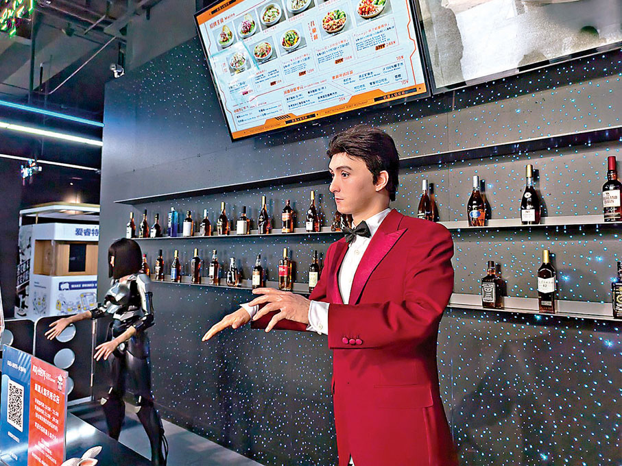 香港文匯報記者看到,在「機器人焰究所」餐廳裏,吧枱調酒師、舞蹈師、送餐的店員等都是機器人,相當酷炫。遍布餐廳各個角落的全息風扇導覽裝置和夢幻光影牆,更是營造出強烈的科幻氛圍,五彩斑斕的動態影像流動,光影交錯間,彷彿進入了一個奇妙的維度。而轉角遇見的機器人,更是感受到科技與藝術完美融合,每一處細節都與眾不同。