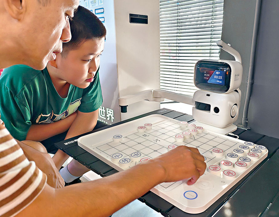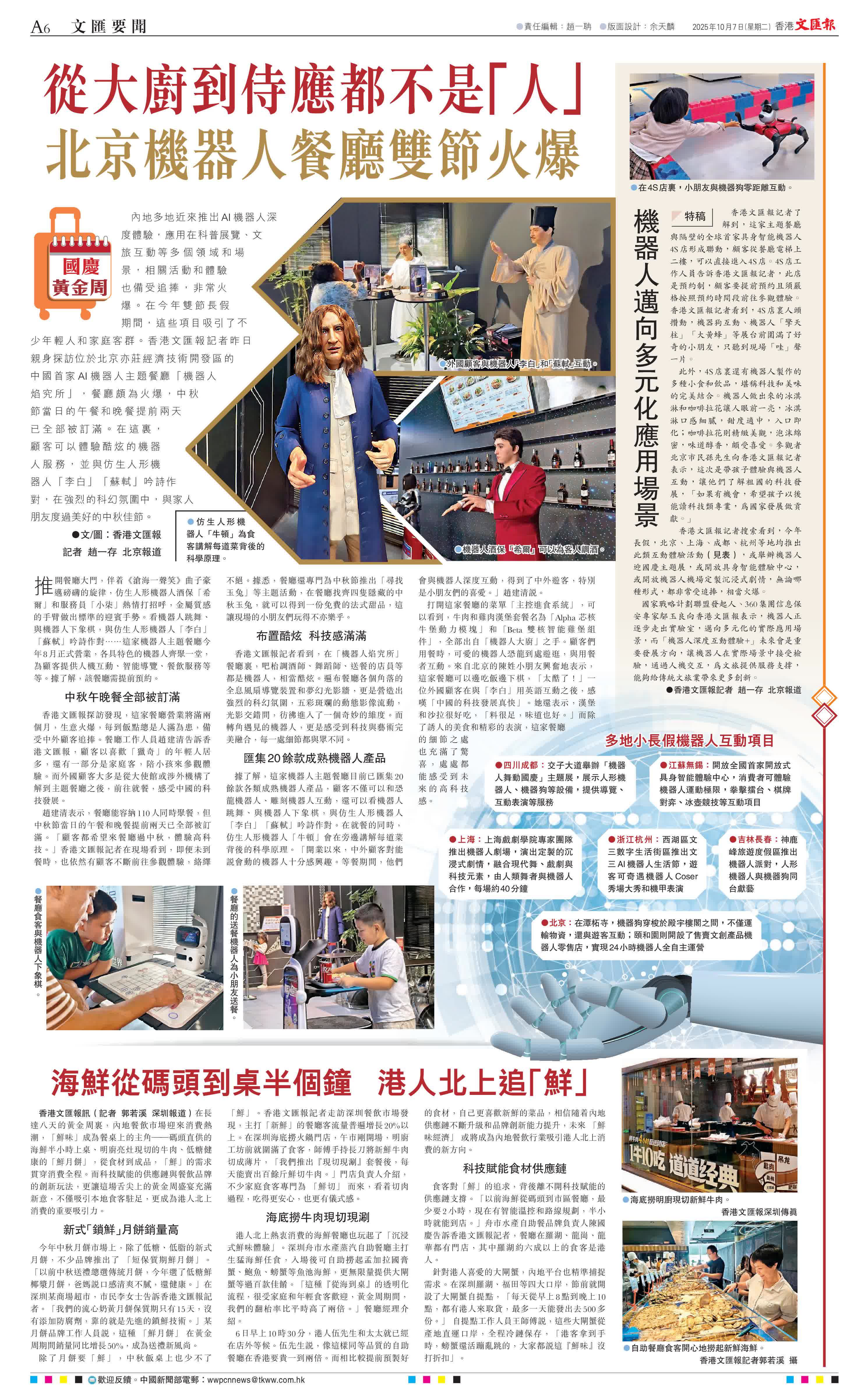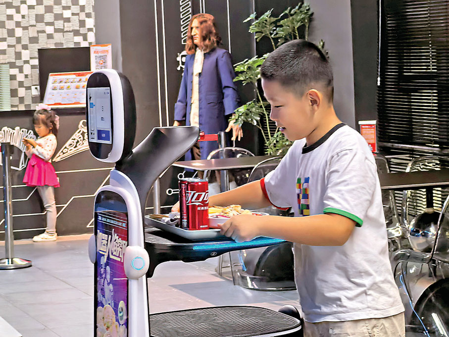 (香港文匯報記者 趙一存 北京報道)內地多地近來推出AI機器人深度體驗,應用在科普展覽、文旅互動等多個領域和場景,相關活動和體驗也備受追捧,非常火爆。在今年雙節長假期間,這些項目吸引了不少年輕人和家庭客群。香港文匯報記者昨日親身探訪位於北京亦莊經濟技術開發區的中國首家AI機器人主題餐廳「機器人焰究所」,餐廳頗為火爆,中秋節當日的午餐和晚餐提前兩天已全部被訂滿。在這裏,顧客可以體驗酷炫的機器人服務,並與仿生人形機器人「李白」「蘇軾」吟詩作對,在強烈的科幻氛圍中,與家人朋友度過美好的中秋佳節。