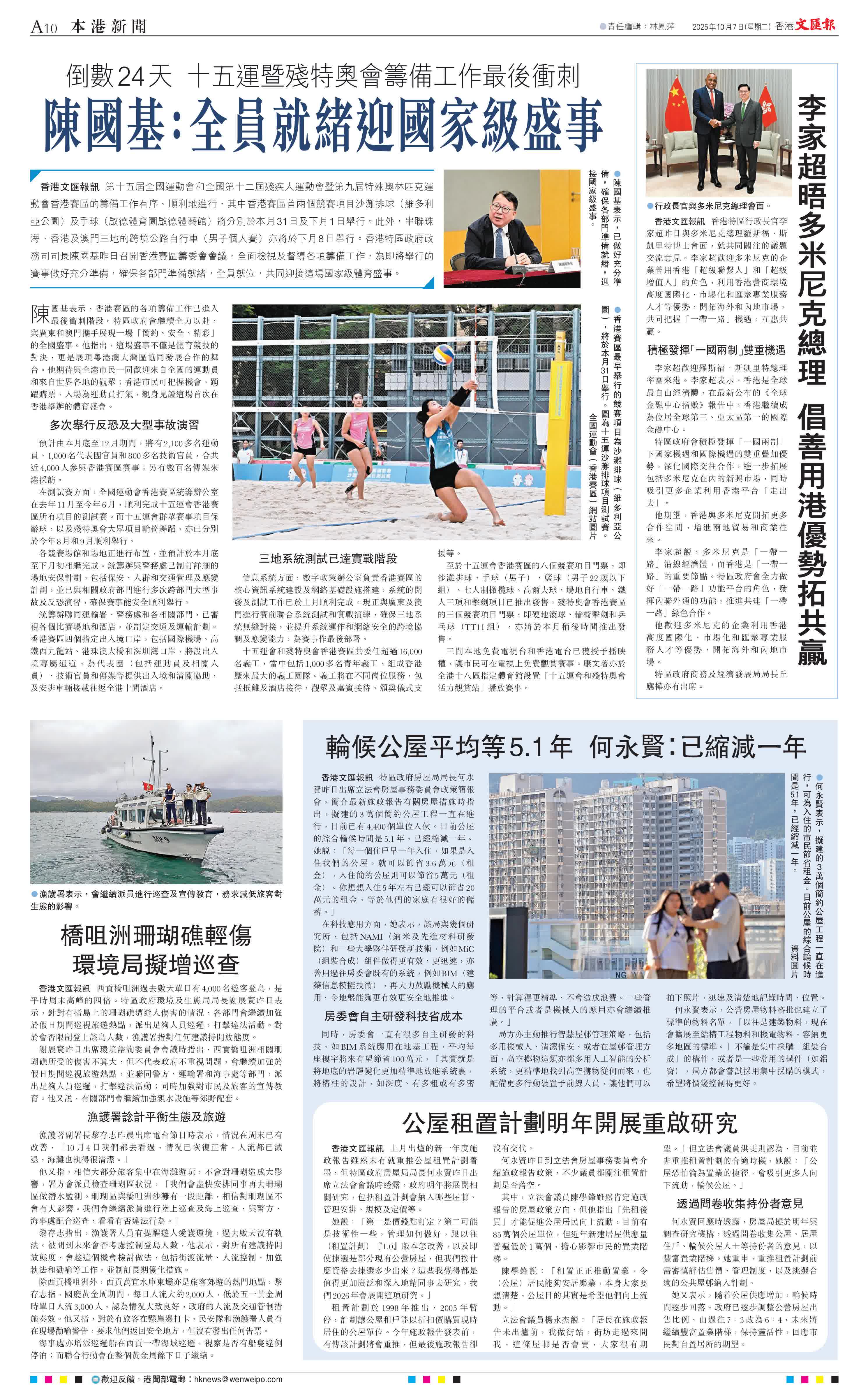 香港文匯報訊 第十五屆全國運動會和全國第十二屆殘疾人運動會暨第九屆特殊奧林匹克運動會香港賽區的籌備工作有序、順利地進行,其中香港賽區首兩個競賽項目沙灘排球(維多利亞公園)及手球(啟德體育園啟德體藝館)將分別於本月31日及下月1日舉行。此外,串聯珠海、香港及澳門三地的跨境公路自行車(男子個人賽)亦將於下月8日舉行。香港特區政府政務司司長陳國基昨日召開香港賽區籌委會會議,全面檢視及督導各項籌備工作,為即將舉行的賽事做好充分準備,確保各部門準備就緒,全員就位,共同迎接這場國家級體育盛事。