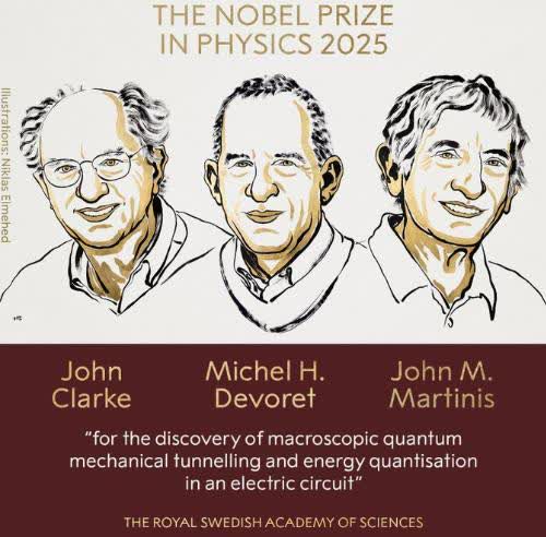 當地時間10月7日,瑞典皇家科學院決定將2025年諾貝爾物理學獎授予科學家約翰·克拉克、麥克·H·德沃雷特、約翰·M·馬蒂尼,以表彰他們「發現電路中的宏觀量子力學隧道效應和能量量子化」。