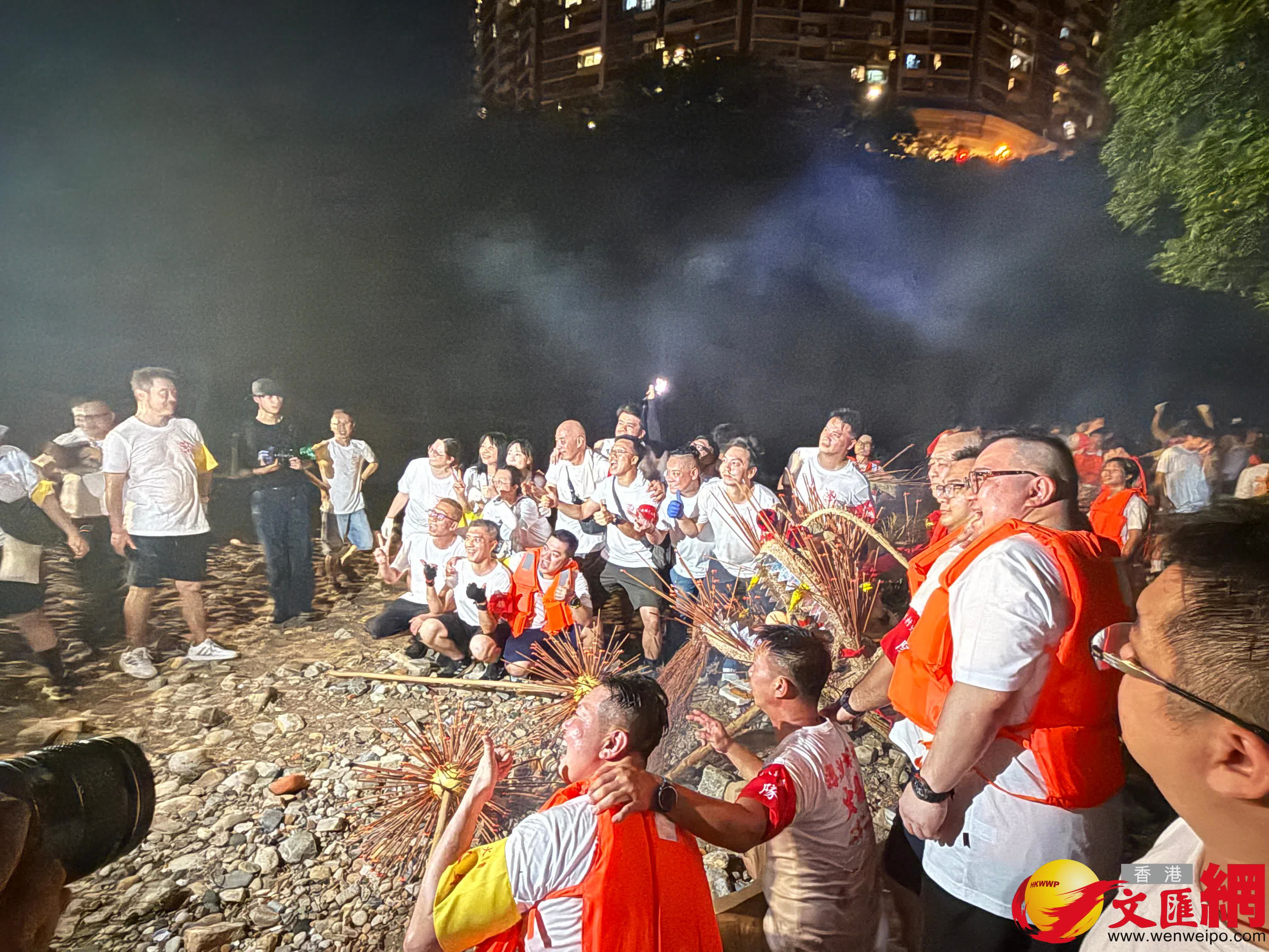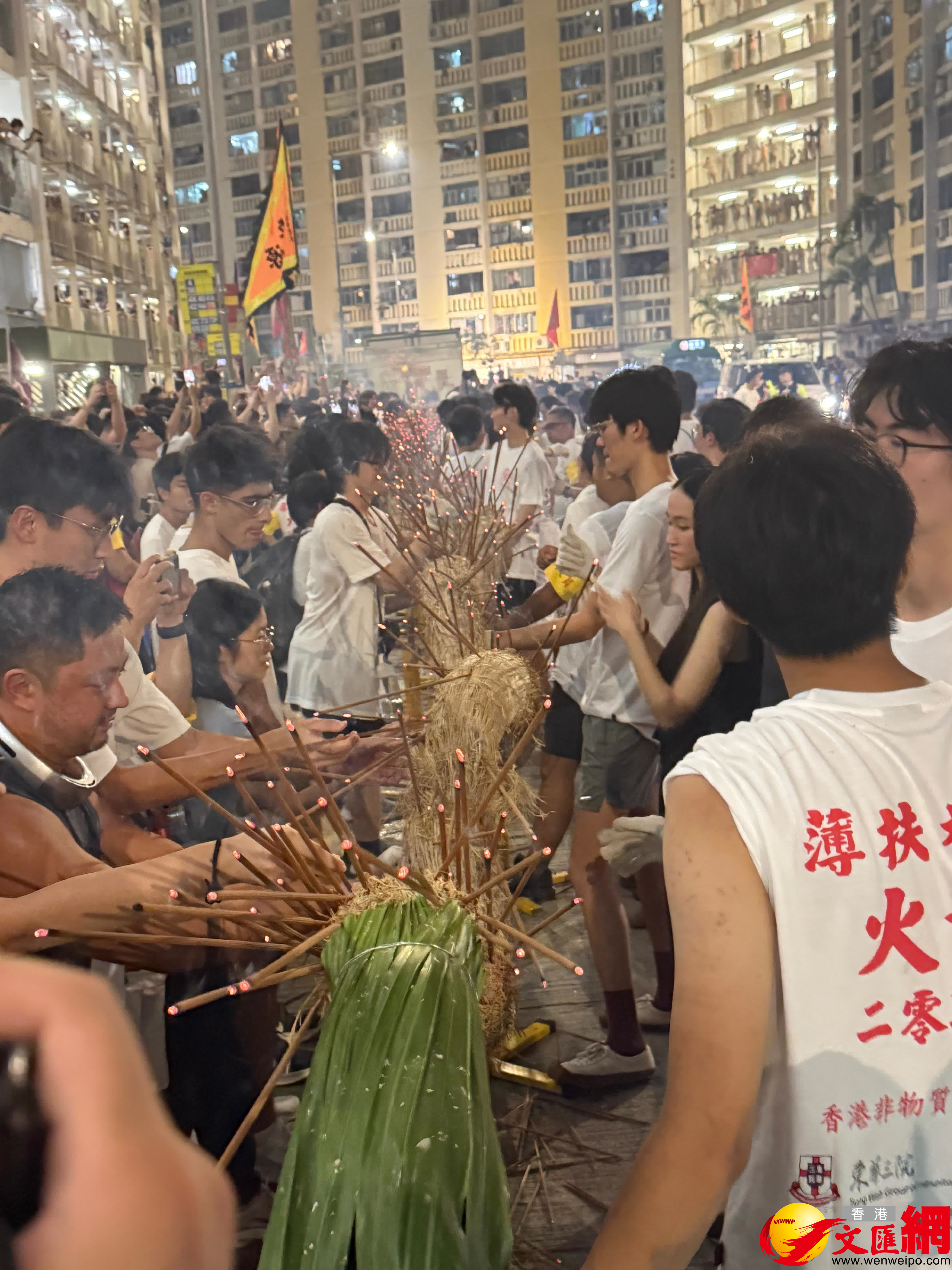 香港文匯報訊 (記者 崔瀅) 「龍頭靈光顯威靈,龍眼豪光鎮乾坤,龍角一點綻八方,龍口珍珠光十方,龍身遊龍鎮四海,風調雨順、國泰民安,雷鼓一響、黃金萬兩,薄扶林村祝願大家身體健康、萬事勝意。」語畢龍騰,薄扶林舞火龍正式揭幕!