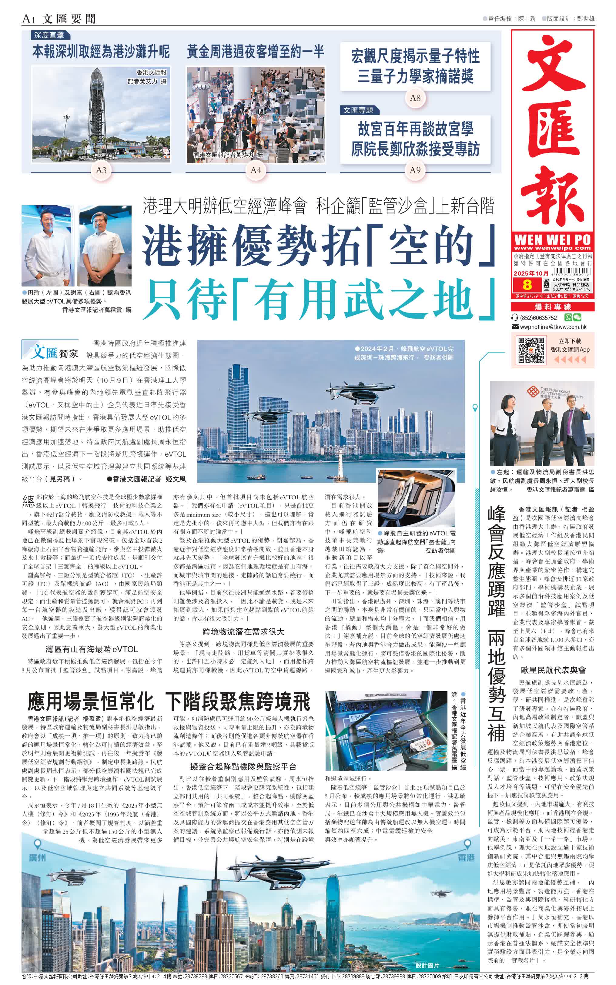 香港文匯報訊(記者 姬文風)香港特區政府近年積極推進建設具競爭力的低空經濟生態圈,為助力推動粵港澳大灣區航空物流樞紐發展,國際低空經濟高峰會將於明天(10月9日)在香港理工大學舉辦。有參與峰會的內地領先電動垂直起降飛行器(eVTOL,又稱空中的士)企業代表近日率先接受香港文匯報訪問時指出,香港具備發展大型eVTOL的多項優勢,期望未來在港爭取更多應用場景,助推低空經濟應用加速落地。特區政府民航處副處長周永恒指出,香港低空經濟下一階段將聚焦跨境運作、eVTOL測試展示,以及低空空域管理與建立共同系統等基建級平台。