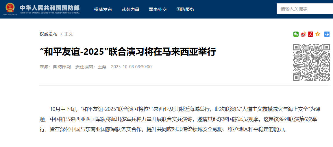 據國防部網站消息,10月中下旬,「和平友誼-2025」聯合演習將位馬來西亞及其附近海域舉行。此次聯演以「人道主義救援減災與海上安全」為課題,中國和馬來西亞兩國軍隊將派出多軍兵種力量開展聯合實兵演練,邀請其他東盟國家派員觀摩。這是該系列聯演第6次舉行,旨在深化中國與東南亞國家軍隊務實合作,提升共同應對非傳統領域安全威脅、維護地區和平穩定的能力。