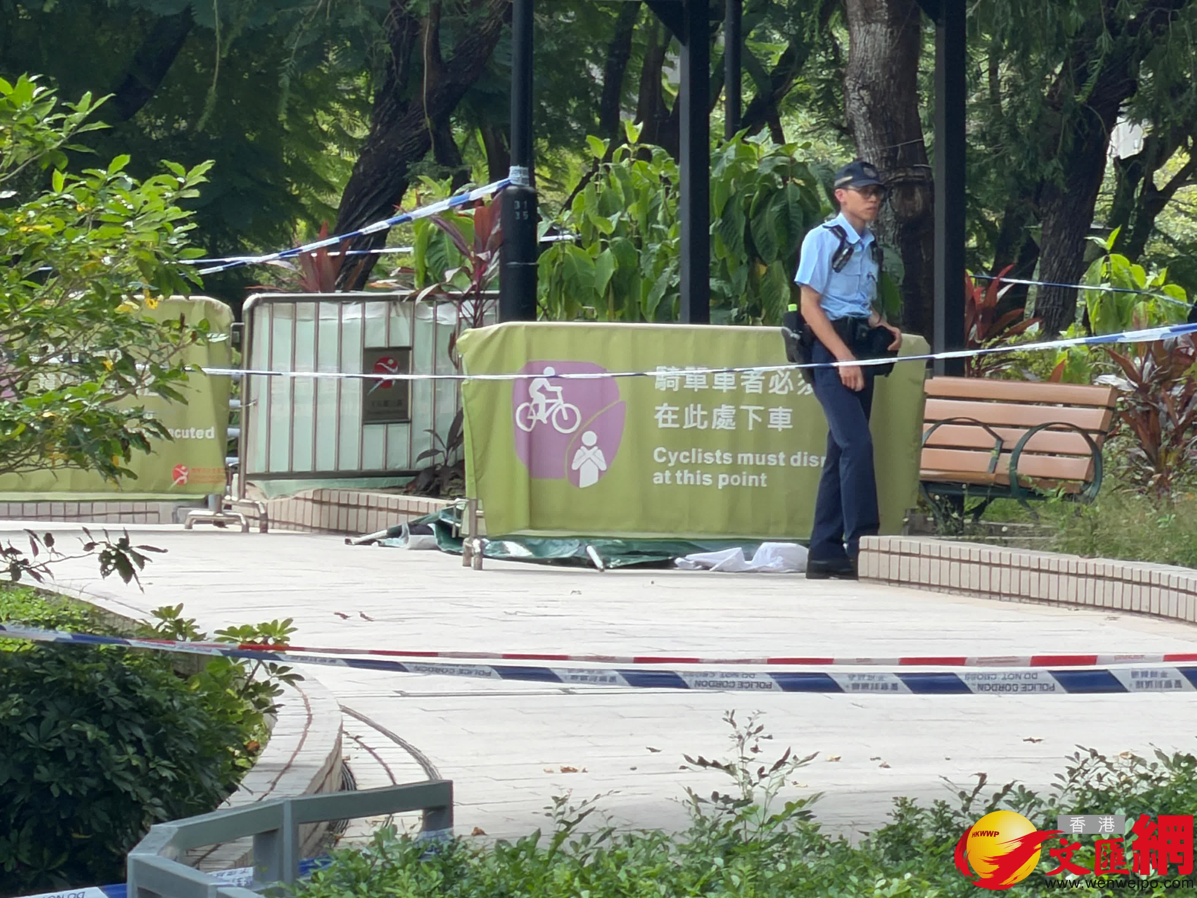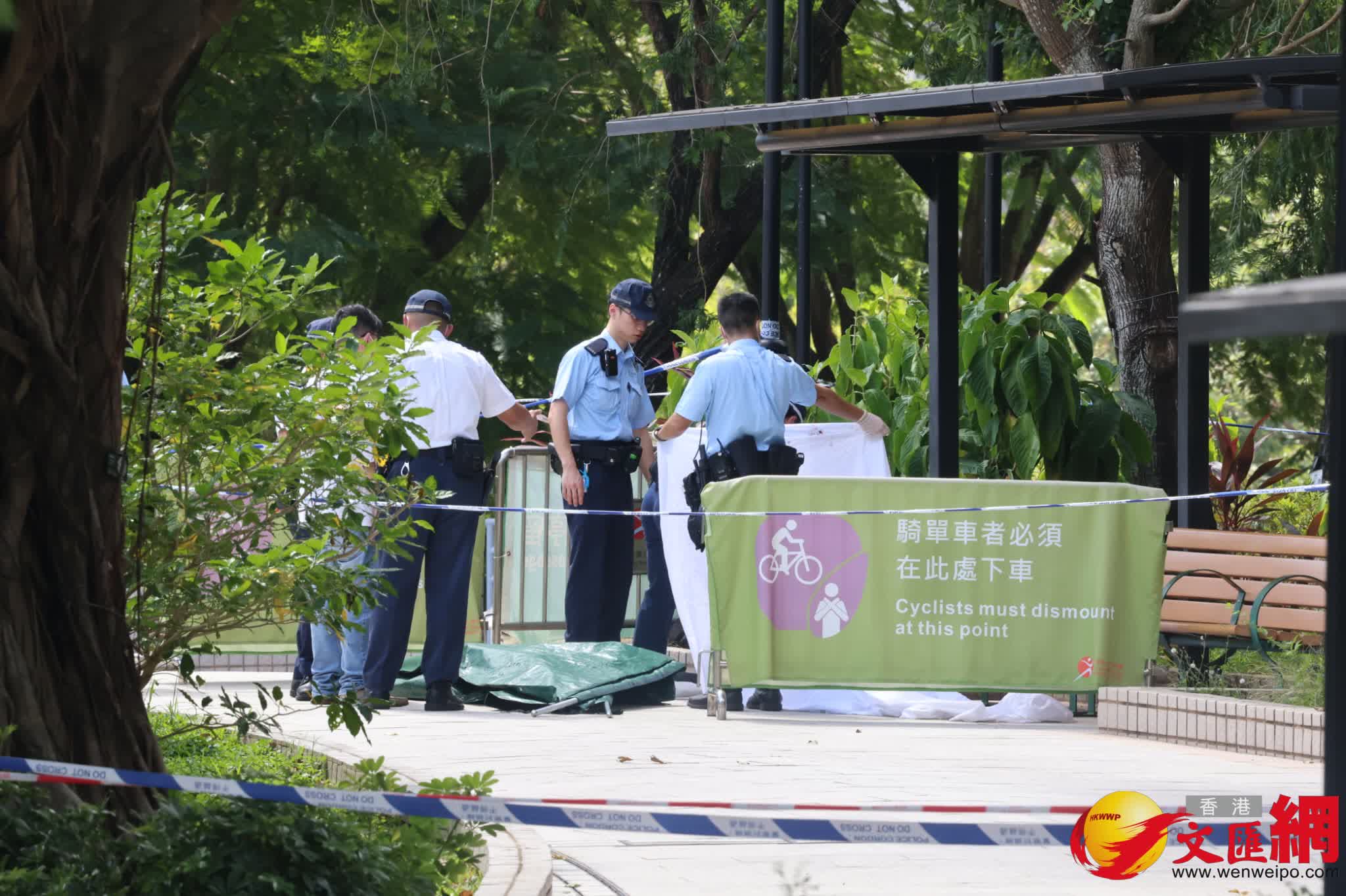 香港文匯報訊(記者 蕭景源)今日(8日)清晨5時許,一名滿身鮮血女子被發現倒臥在天瑞路6號天水圍公園近天瑞邨出入口一個涼亭對開木凳上,救護員到場證實女子已經死亡;警方初步發現死者頸部有刀傷,附近檢獲一把15厘米長的刀及一把𠝹刀,不排除事件有可疑,隨即封鎖現場及用帳篷將死者遺體遮蓋進行調查。