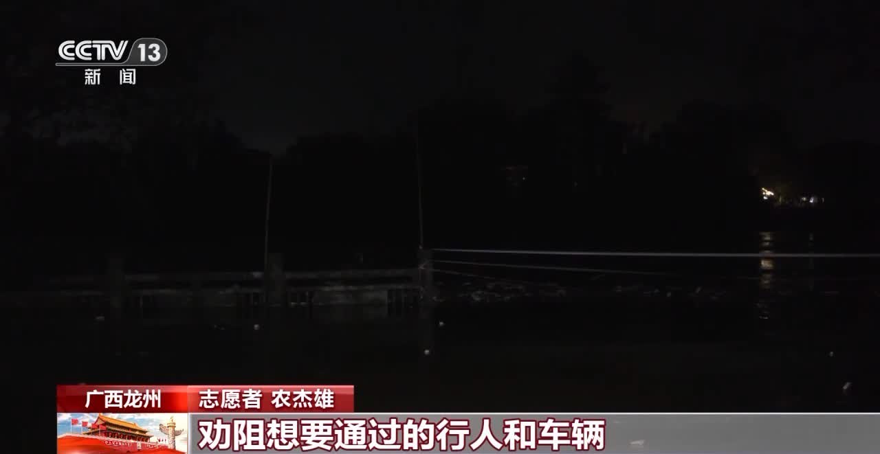 志願者 農傑雄:我們24小時輪班值守,主要任務是一邊密切觀察水位變化,一邊封控橋和前面的低洼路段,勸阻想要通過的行人和車輛。