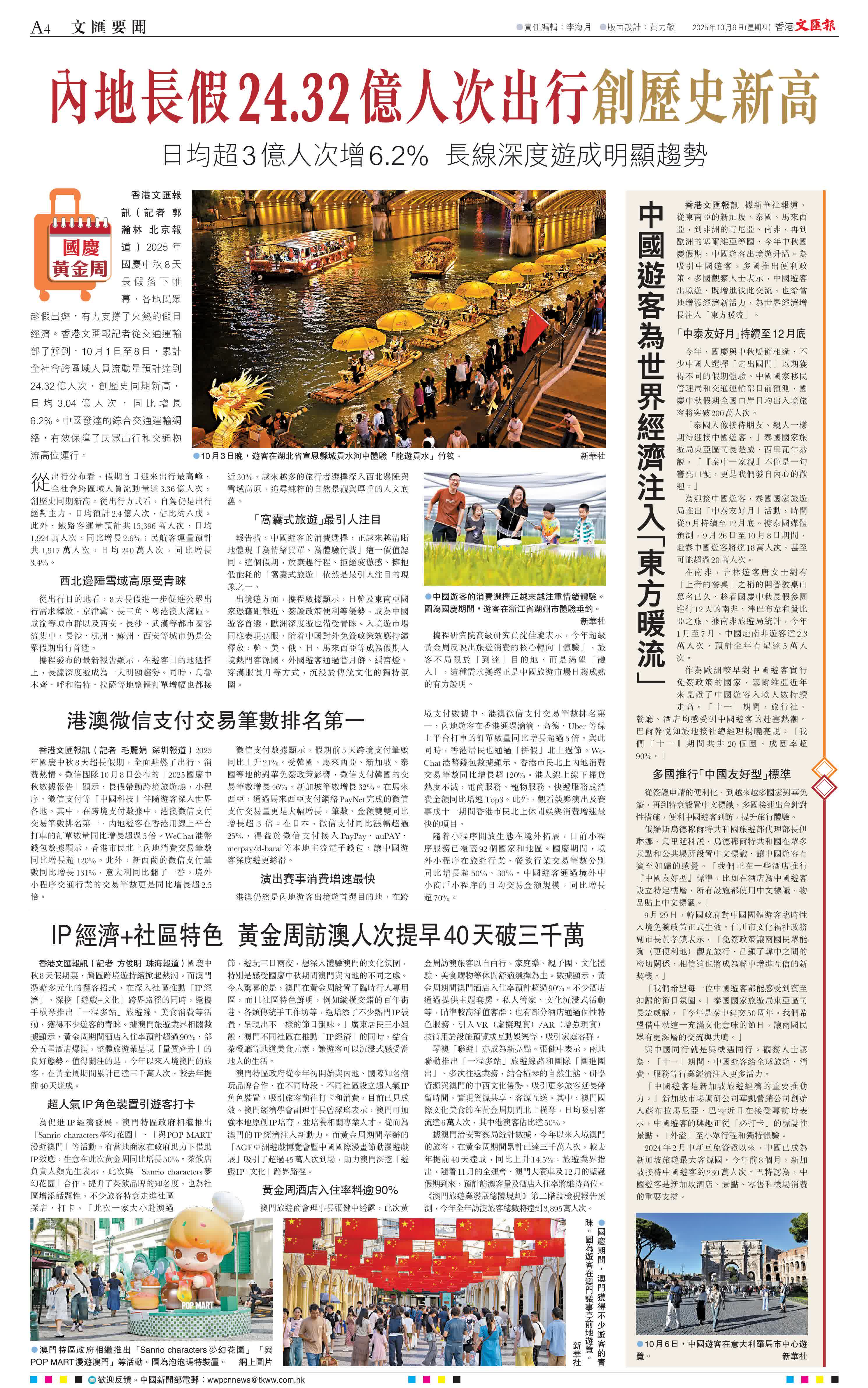 (香港文匯報記者毛麗娟 深圳報道)2025年國慶中秋8天超長假期,全面點燃了出行、消費熱情。微信團隊10月8日公布的「2025國慶中秋數據報告」顯示,長假帶動跨境旅遊熱,小程序、微信支付等「中國科技」伴隨遊客深入世界各地。其中,在跨境支付數據中,港澳微信支付交易筆數排名第一,內地遊客在香港用線上平台打車的訂單數量同比增長超過5倍。WeChat港幣錢包數據顯示,香港市民北上內地消費交易筆數同比增長超120%。此外,新西蘭的微信支付筆數同比增長131%,意大利同比翻了一番。境外小程序交通行業的交易筆數更是同比增長超2.5倍。