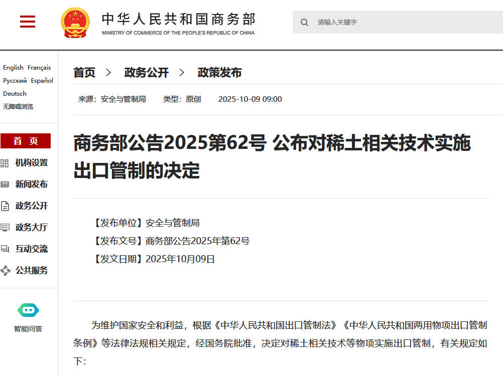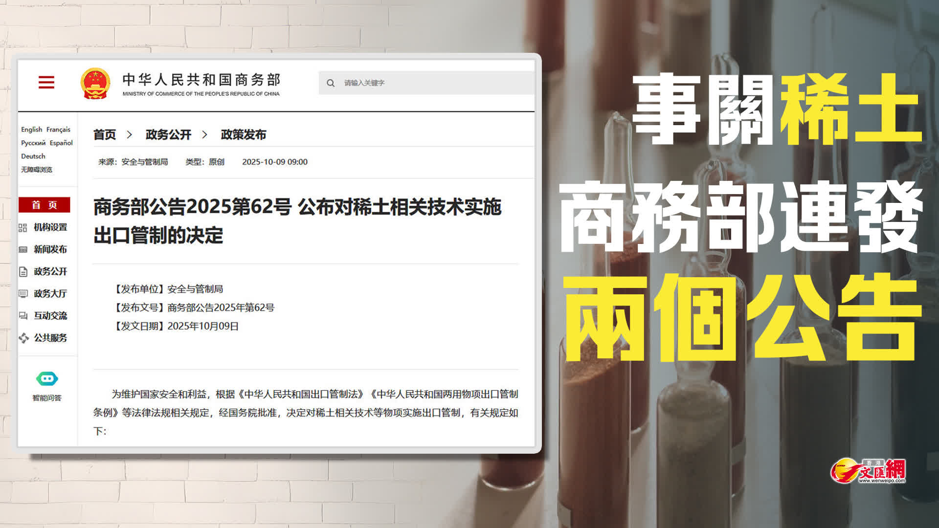 香港文匯網訊 今日(9日),商務部發布2025第62號公告,公布對稀土相關技術實施出口管制的決定。