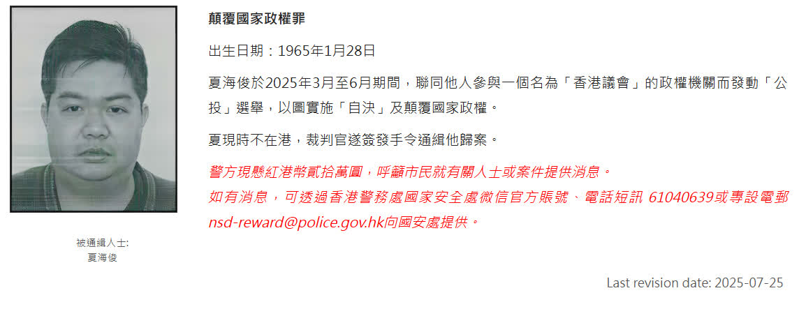 香港文匯報訊(記者 蕭景源)香港警務處國家安全處,今日(10月9日)早上在將軍澳帶走通緝犯夏海俊的72歲兄長協助調查。