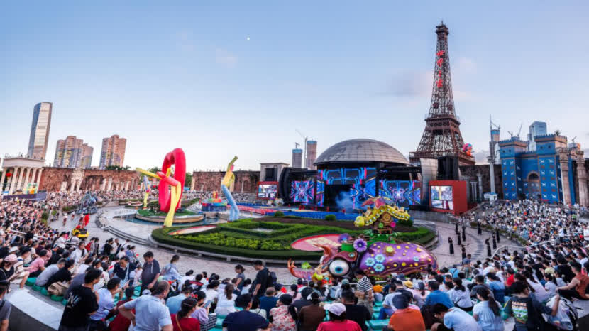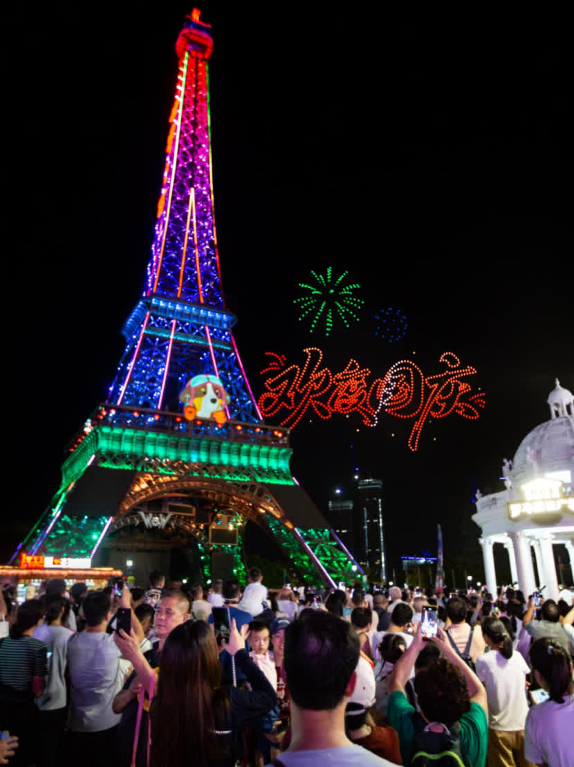隨着夜幕降臨,「全民街頭卡拉OK」引發全場共鳴,場面溫馨;「Darling迪斯科舞會」則在專業DJ的帶動下,以經典旋律點燃夜晚激情。還有全新火秀《狂暴之火》以燃燒的火焰引爆全場氣氛;《非遺雙絕·天地焰》火壺打鐵花表演以熾熱的鐵水點亮夜空。而作為國慶中秋雙節限定節目,連續八晚亮相的千架無人機天幕大秀,通過科技與藝術的完美融合,在夜空中繪出節日祝福與動人圖景,為遊客的黃金周之旅留下了璀璨而難忘的收官回憶。