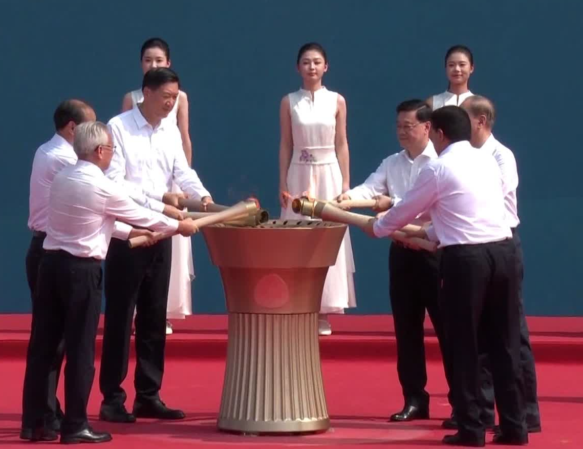 在點燃火種盆環節,採火少女在「源火」台引燃手中的採火棒,國家體育總局、中國殘聯、廣東省委省政府主要負責同志與香港、澳門特別行政區行政長官共同登台,一起點燃十五運會和殘特奧會火種盆,寓意粵港澳三地攜手共進、同心築夢。
