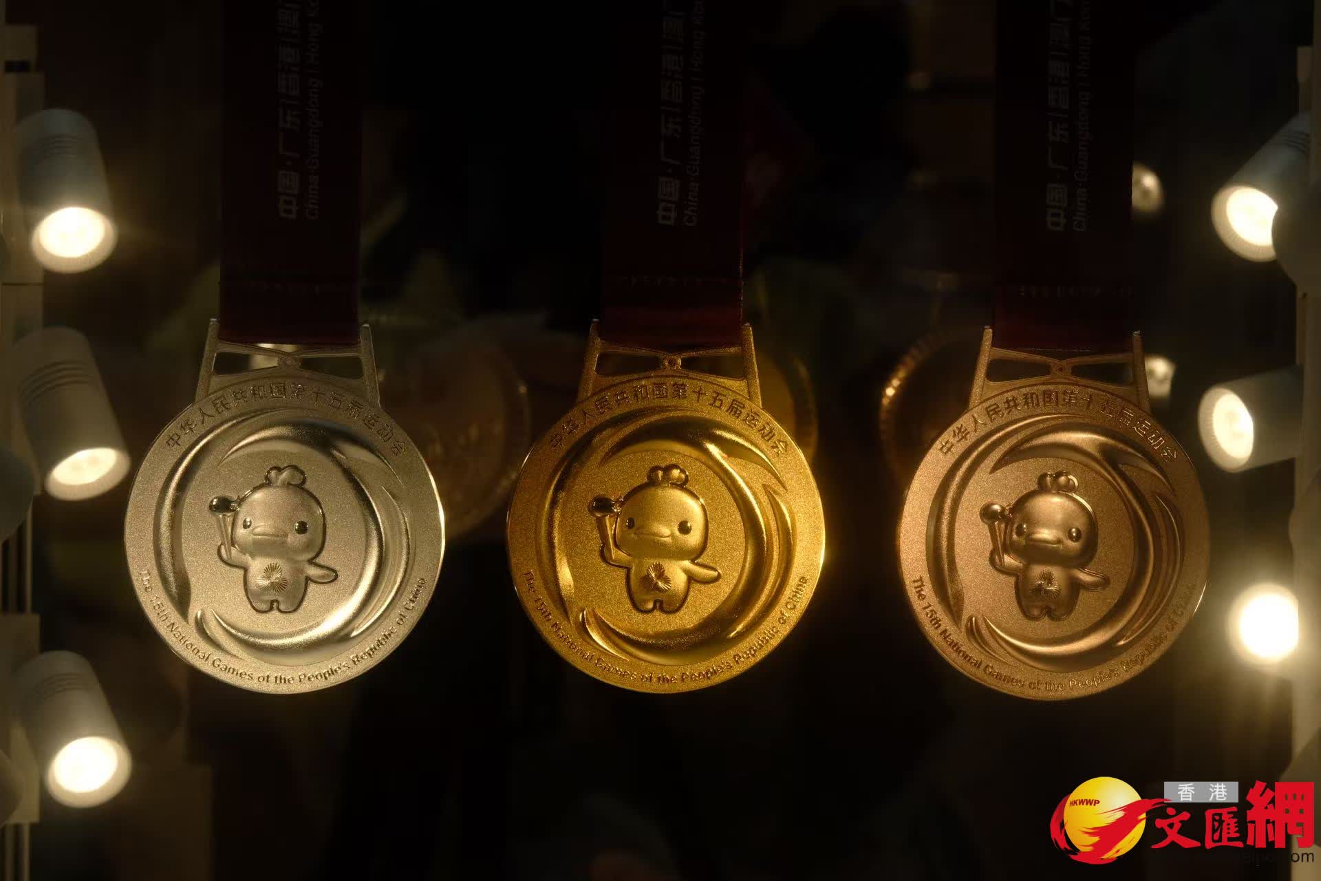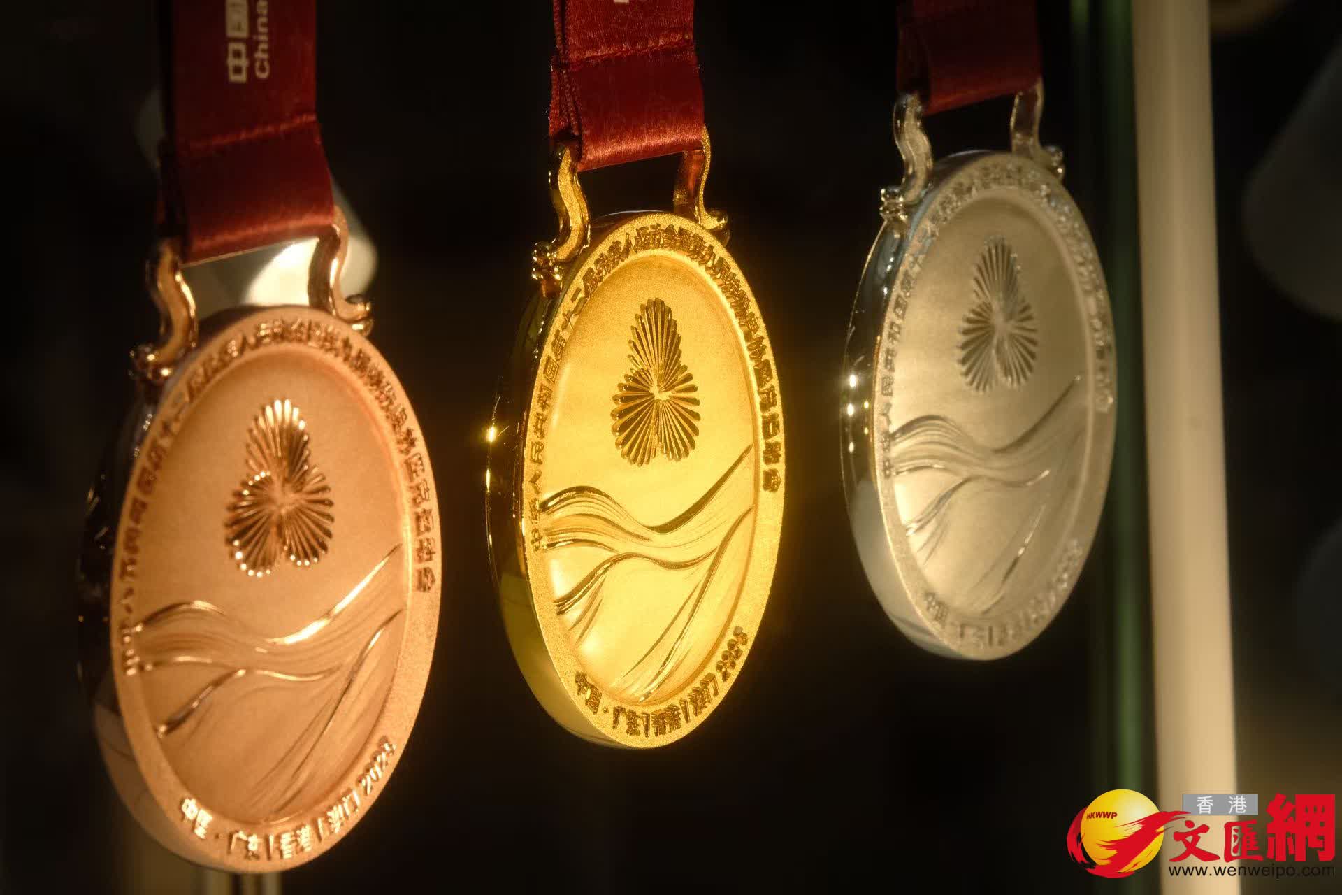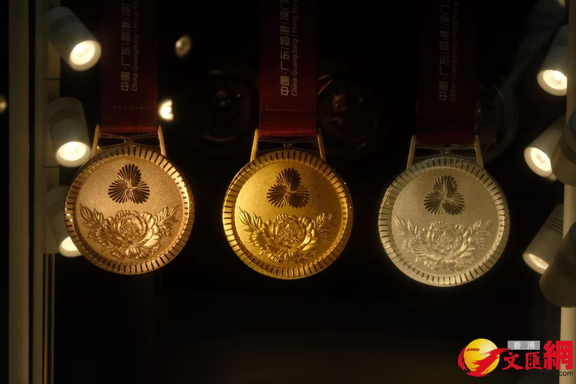 周大福珠寶集團創作總經理、第十五屆全國運動會獎牌項目總設計師林鴻勝表示,獎牌名為「同心躍」,代表大灣區粵港澳三地同心協力,共躍未來,競體獎牌項目更特別採用「三花映牡丹」概念,以官方會徽加上有「百花之王」之稱的牡丹構圖,象徵大灣區背靠祖國共同繁榮發展。至於獎牌外圍設計,三水寓意珠江、香江和濠江匯合的壯觀景象,環狀水紋組成三組莫比烏斯環,呈現生生不息的連續與無限可能。林鴻勝說,獎牌外邊更綴以66道刻紋,致敬全運會66年歷史。